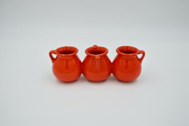 Trois pots réunis en un seul. Il y a un autocollant avec un logo et le texte : un produit Velsen. Fabrique de céramique Velsen produite à Sassenheim à partir de 1942. En très bon état. L : 21 cm. - L : 7 cm. - P : 7 cm. - 384 grammes.
