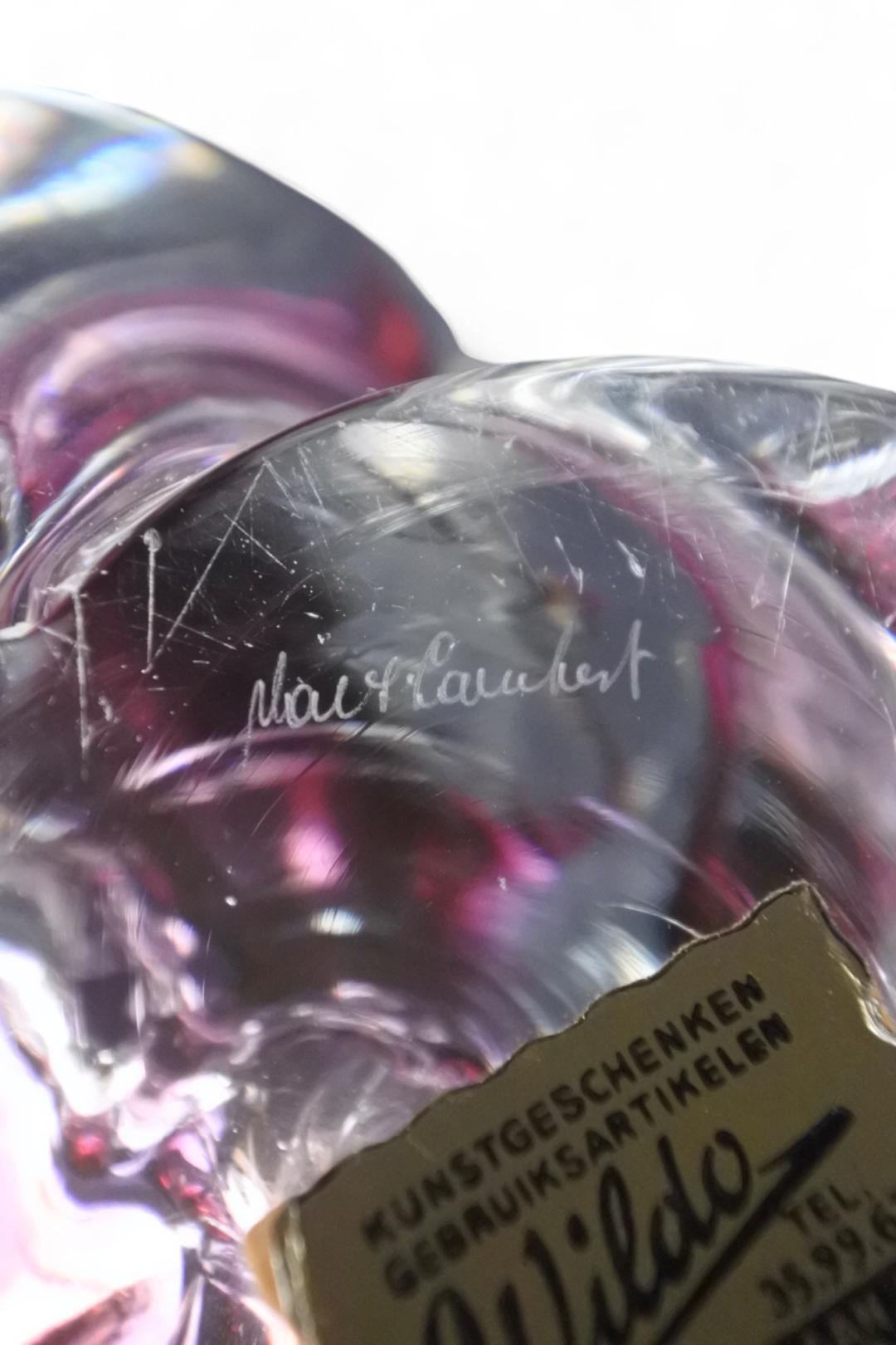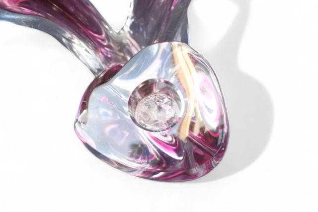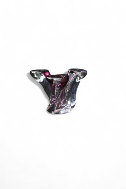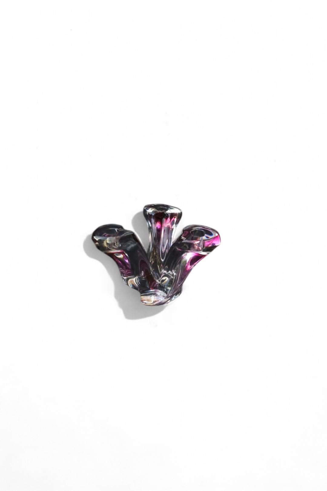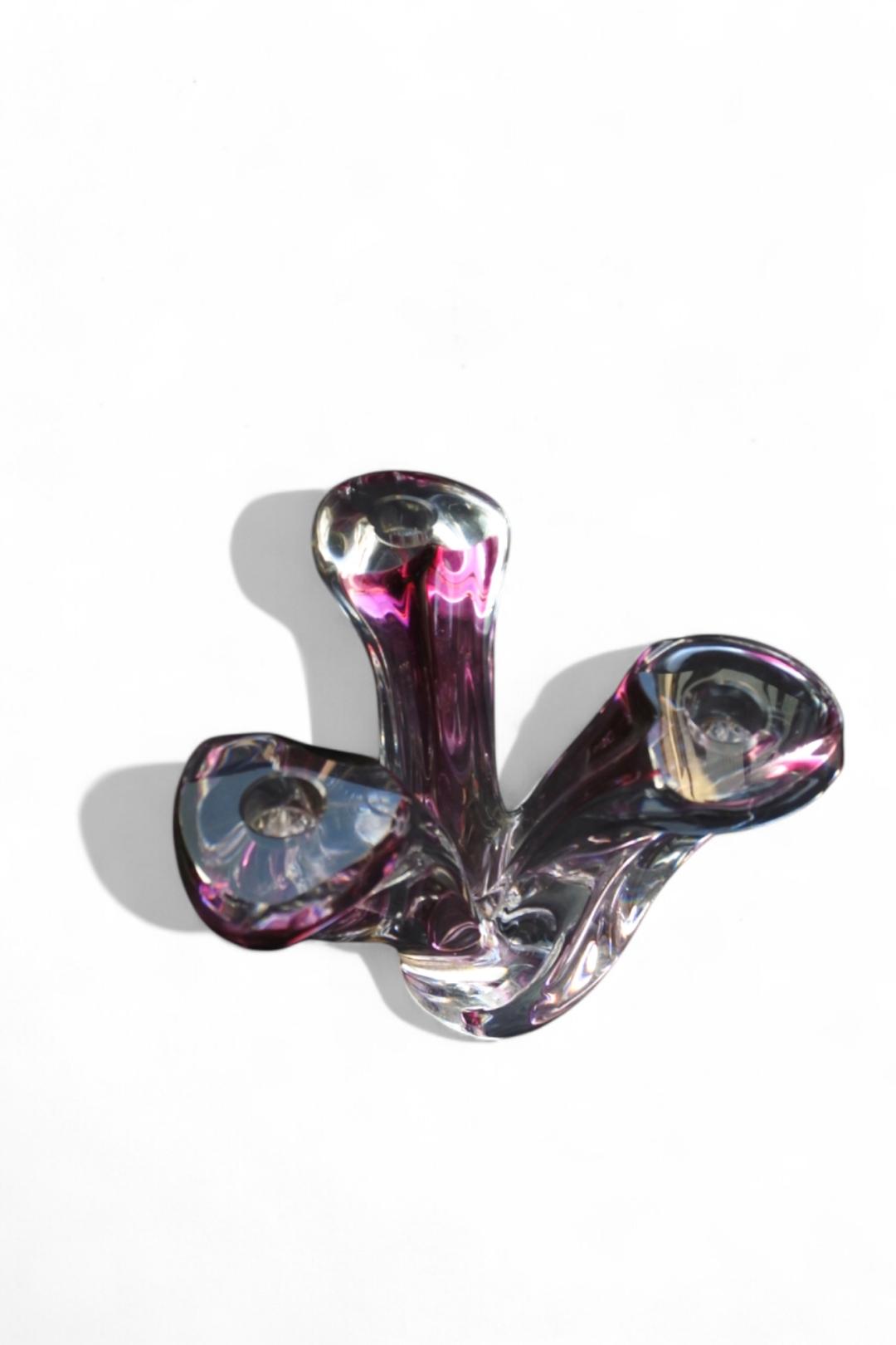 Cristal avec un mélange de couleur améthyste. Le candélabre peut accueillir 3 bougies. 1950's. Très bon état avec des signes minimes d'utilisation. H : 17 cm. - L : 24 cm. - P : 24 cm. - 4,32 kg.