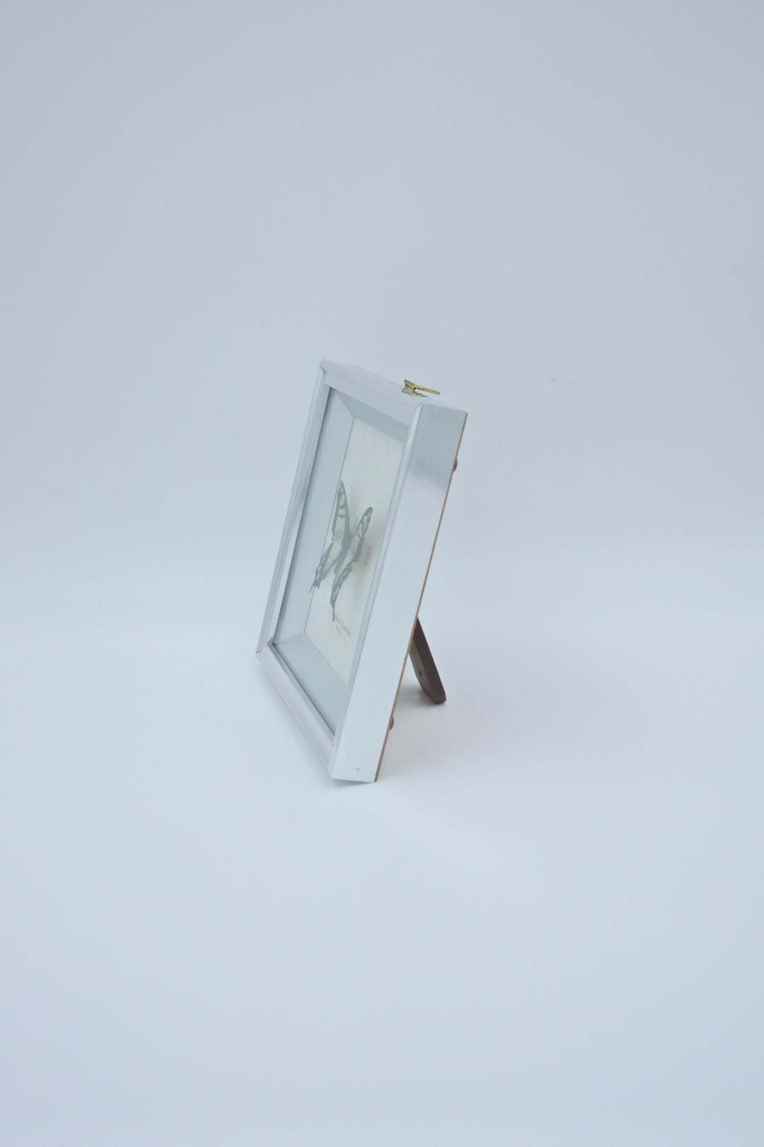 Magnifique papillon bleu (bouteille bleue vitreuse) dans un cadre en bois avec un cadre en aluminium élégant. A suspendre ou à poser. Le papillon mesure env. 6 centimètres. Le cadre mesure 17*17 cm.