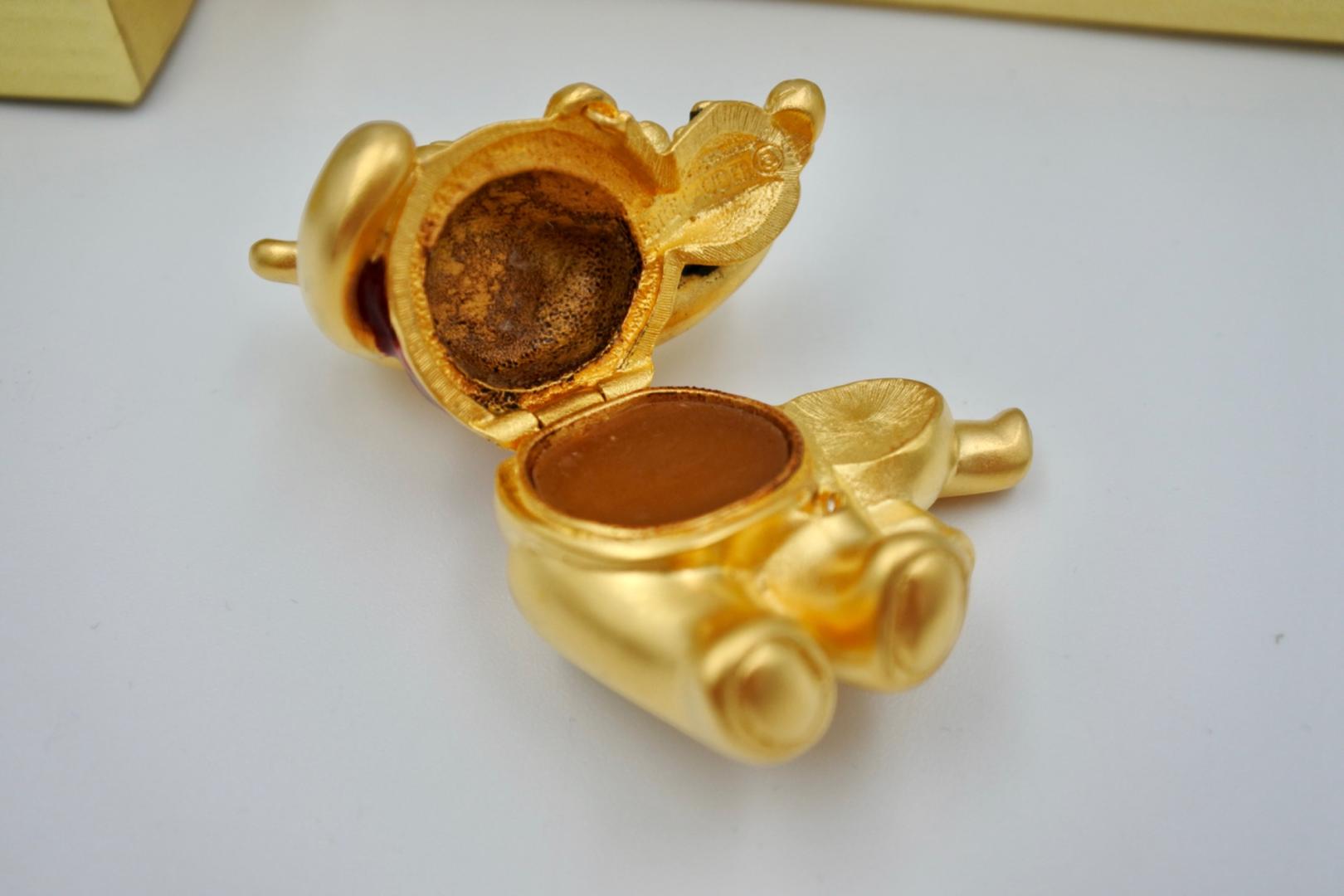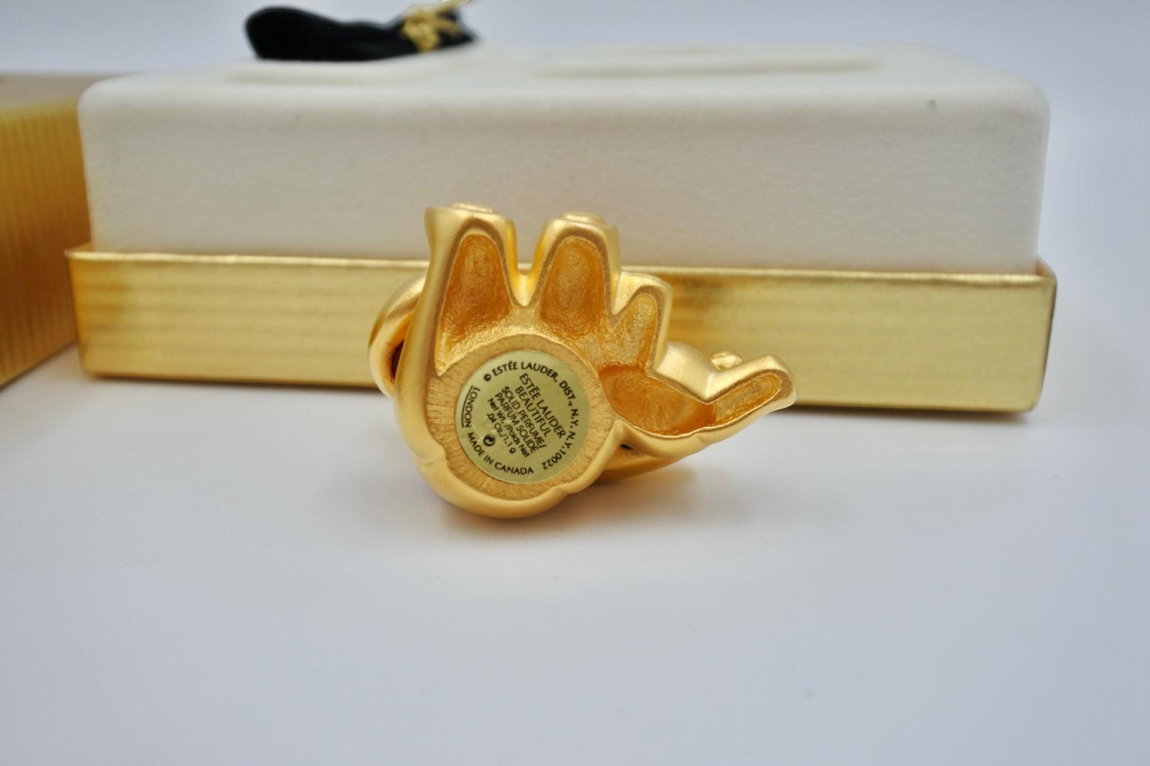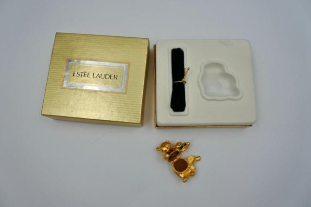 Pièce de collection : parfum solide Beautiful Teddies d'Estée Lauder. Le parfum se présente sous la forme de deux oursons dorés recouverts d'émaille. Livré avec une pochette en velours et son coffret original.
