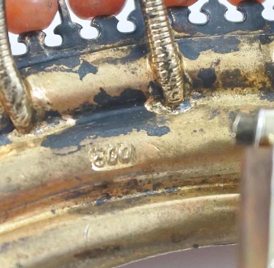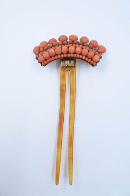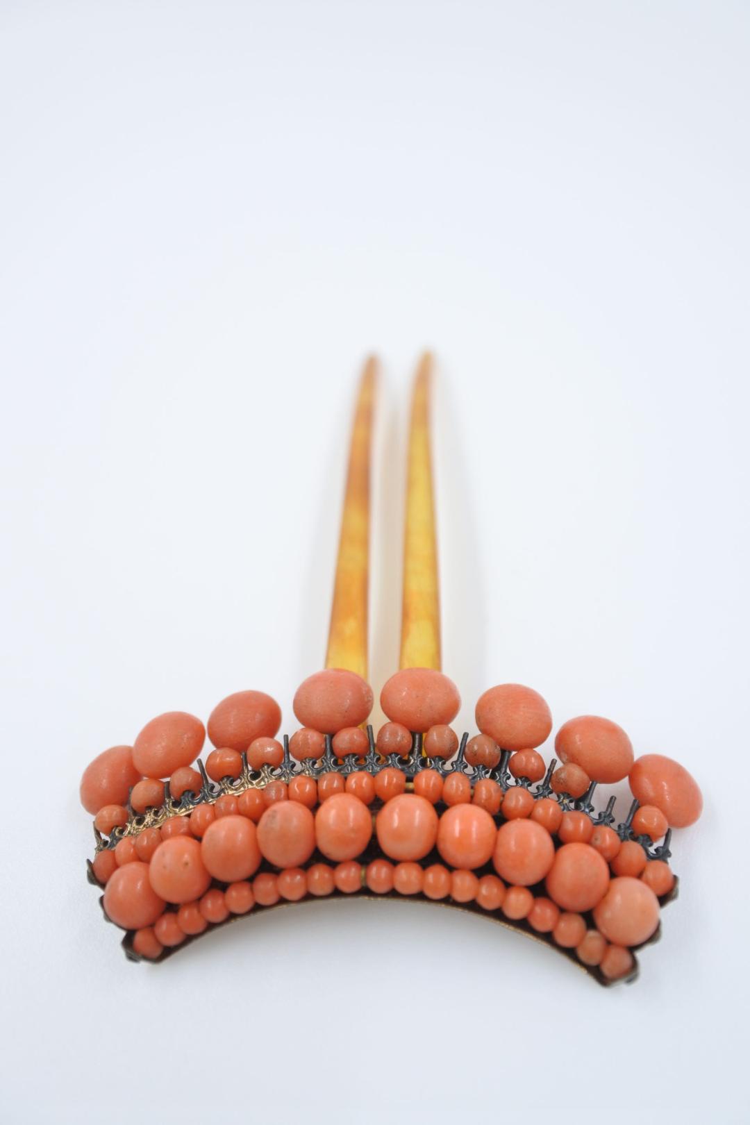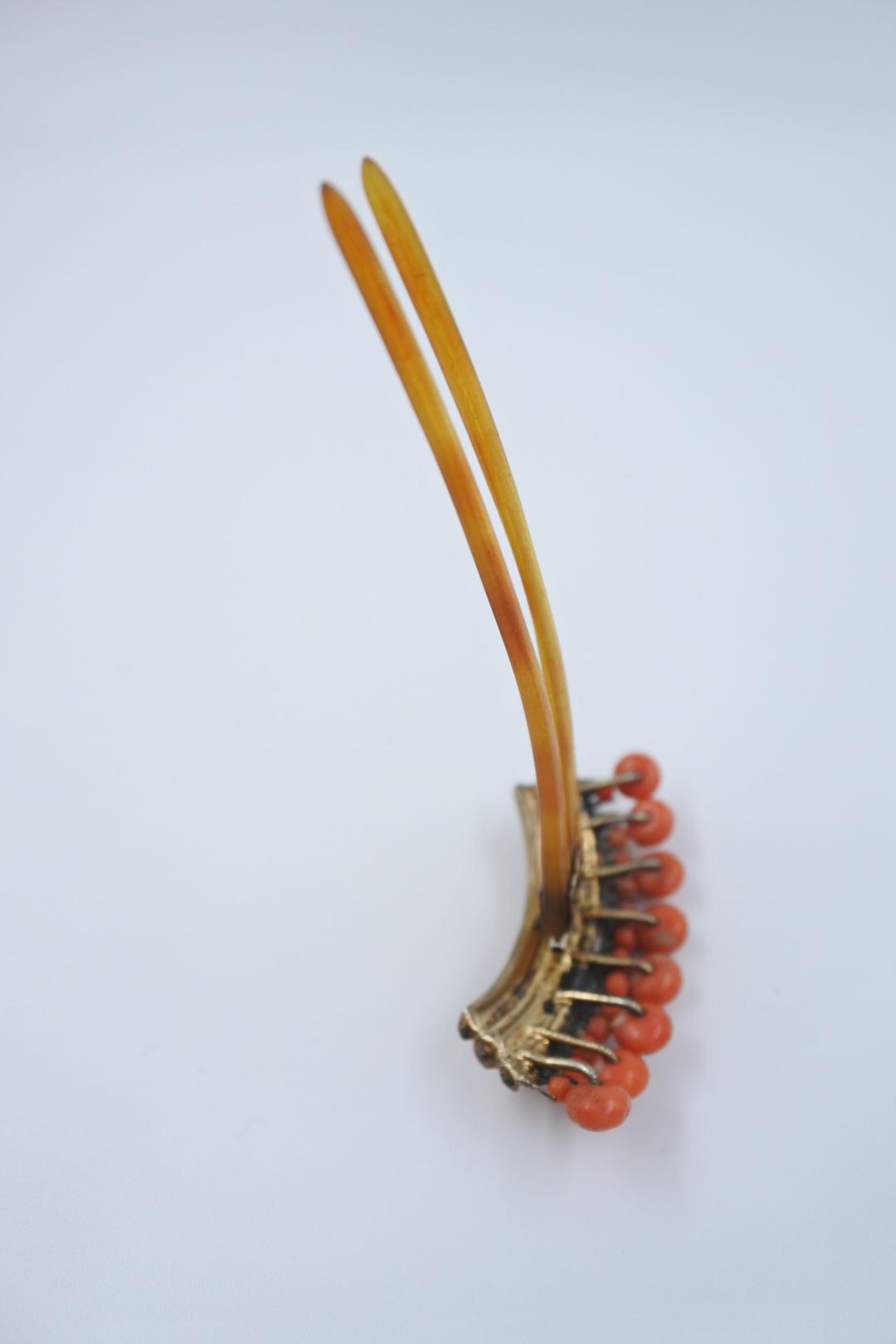 Ancienne peigne pic à cheveux en argent vermeil, corail et corne 19ème XIXe siècle. Ere Victorienne. Très bon état, juste manque d’un petit corail. Cachet G* et 800. L: 9 - W: 5,5 cm.