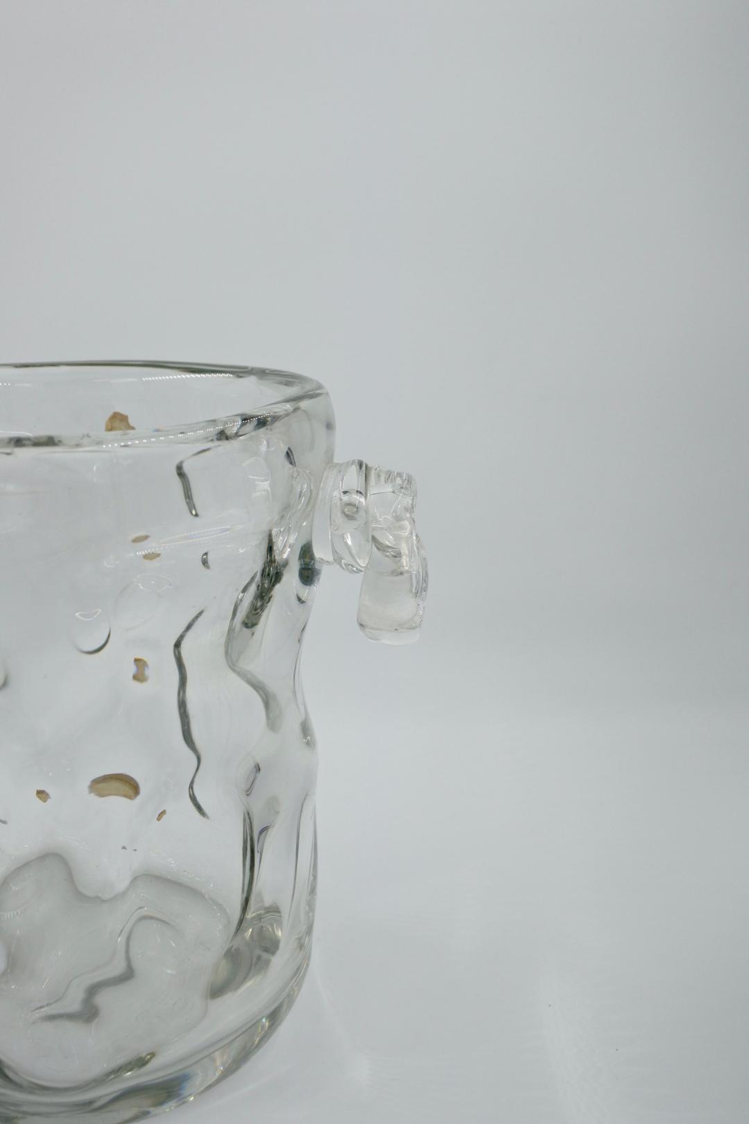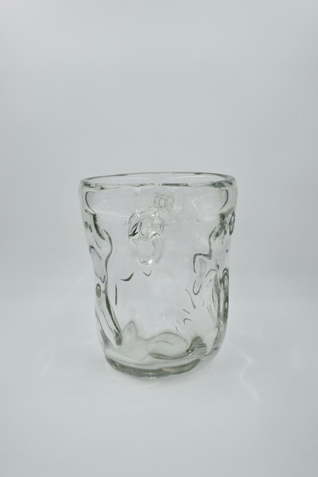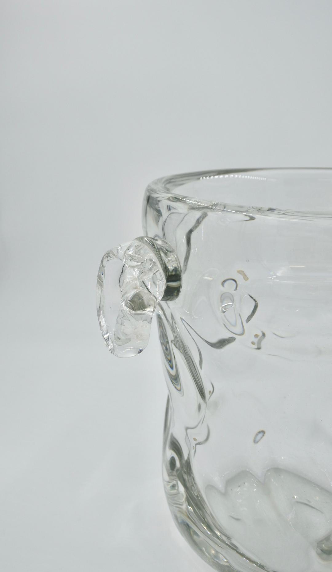 Grand rafraîchisseur à vin ou vase en cristal français avec poignées latérales nouées et appliquées à la main, avec marque de fabricant pour Cristal J B France. J B signifie Joseph Bleichner qui était le principal concepteur de St. Louis Crystal, France de 1903 à 1957. Bon état avec des signes mineurs d'utilisation. H : 24,5 – L : 28 – ouverture : 20 cm. 6,4 kilos