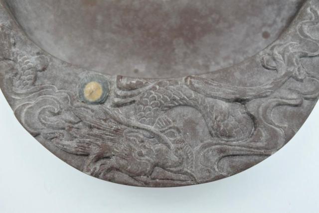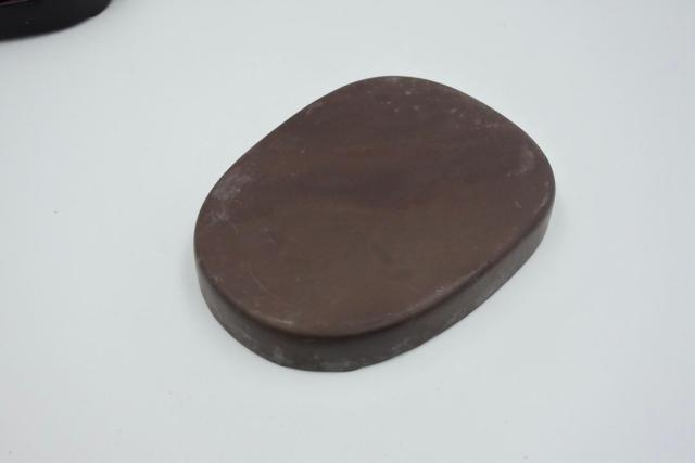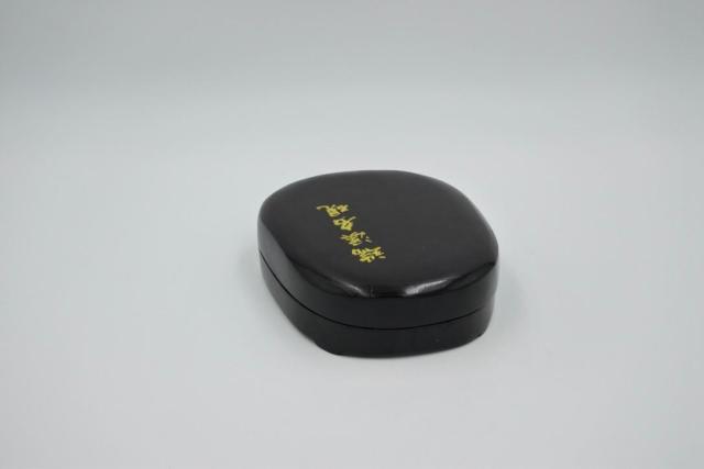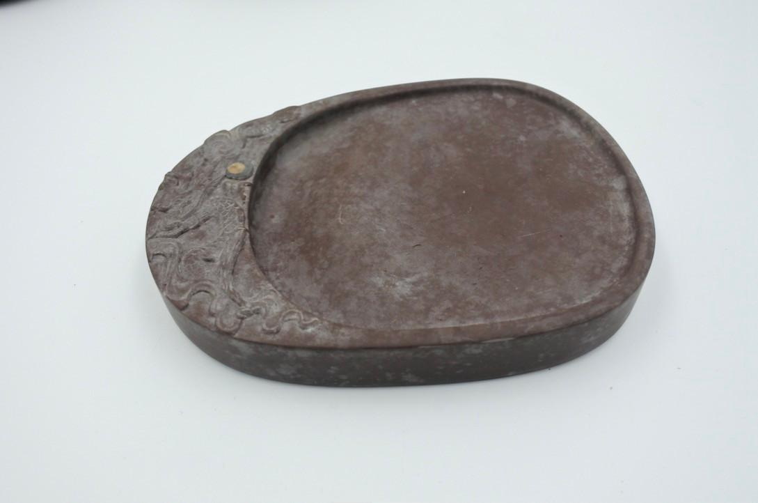 De beroemde Chinese Duan-inktsteen, gesneden met het traditionele Chinese draaksymbool, wordt tentoongesteld in een op maat gemaakt houten kistje. De Chinese draak wordt beschouwd als een van de belangrijkste gelukssymbolen voor macht, geluk en voorspoed, overvloed en welvaart, het behalen van groot succes, bescherming tegen ongunstige geesten en gebeurtenissen in het leven, wijsheid en moed, loyaliteit, een sterk zelfbeeld, een gelukkig huwelijk en blijvende liefde. Om inkt te maken van de inktstaaf, moet deze op een cirkelvormige manier tegen het bevochtigde oppervlak van de inktsteen worden gewreven. Afhankelijk van de gewenste kleurintensiteit, dompelt de kunstenaar het penseel in verschillende delen van de steen. Hoe meer water, hoe minder intens de kleur van de zwarte inkt. Afmetingen: 16 * 12 * 4 cm. (houten kist)