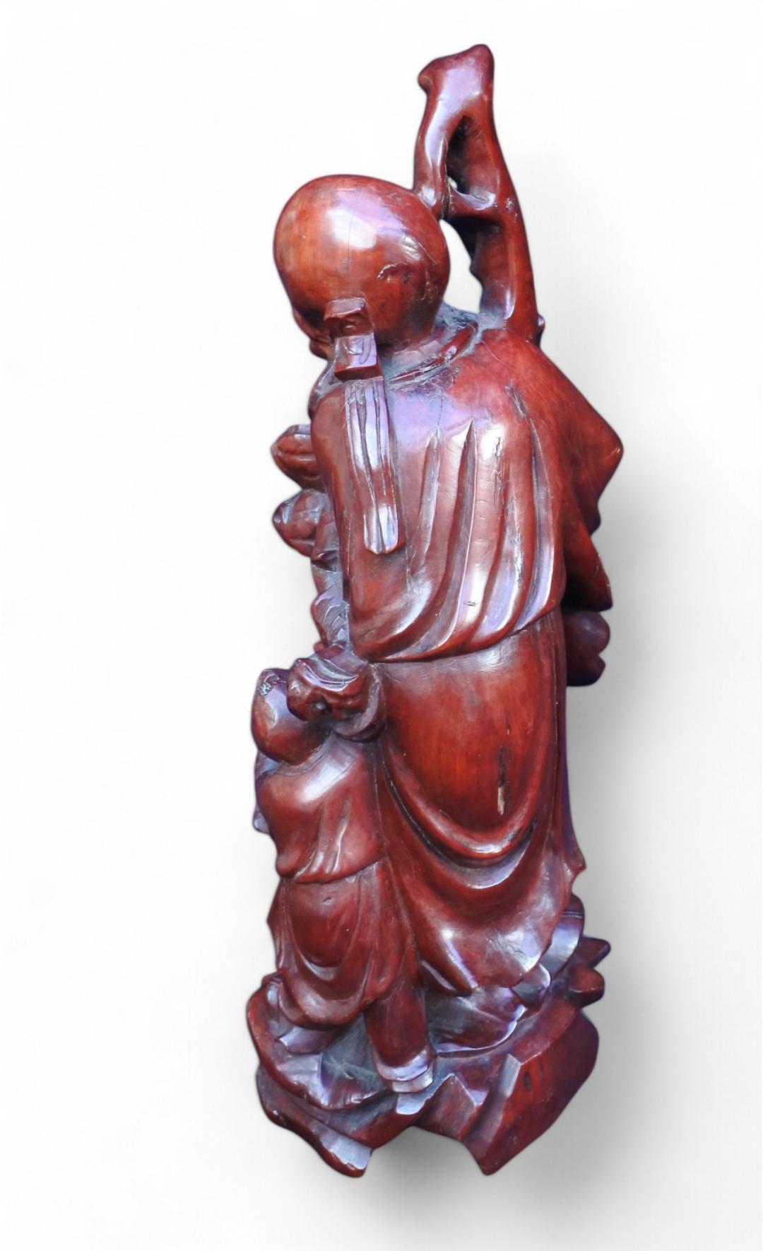 In hout gesneden figuur – vintage – Hong Kong 1967 – Shou Xing of de god van het lang leven. Mooie vintage toestand met normale gebruikssporen en barsten omwille van de werking van het hout. H: 31cm. – W: 11 cm. – 0,86 kilo