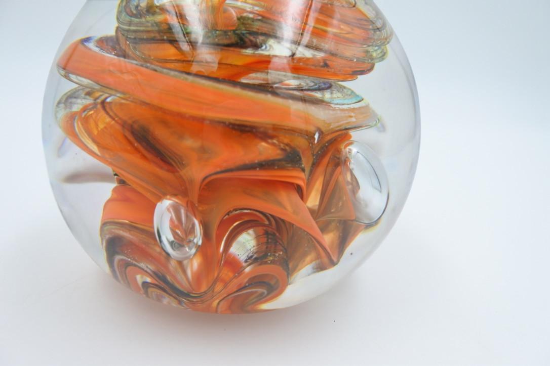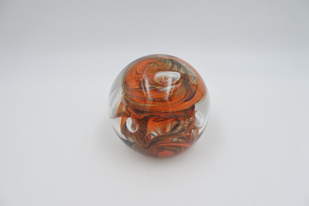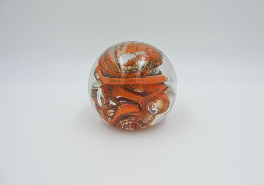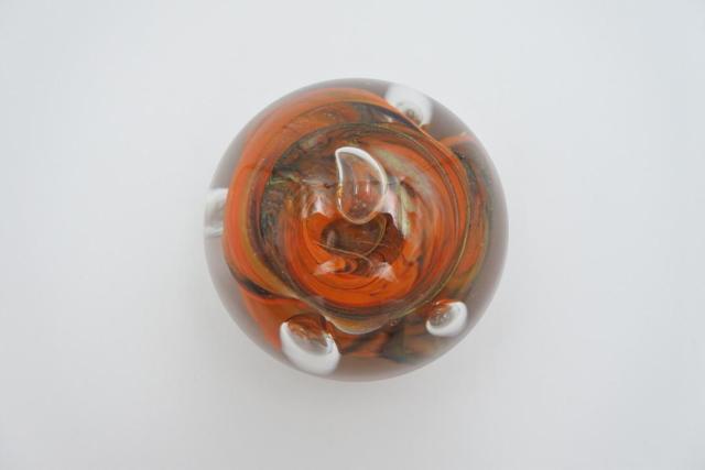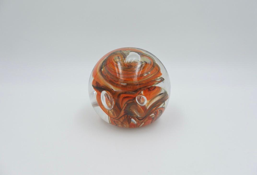 Mondgeblazen glazen presse-papier met verschillende luchtbellen en kleuren. In zeer goede conditie. 1,23 kilo. Ø 13 cm.