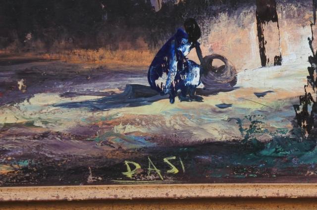 Afrikaans dorpsgezicht gesigneerd Dasi. Olieverf op canvas. Het doek is een stuk van een grote meelzak. Zeer decoratief. Goede staat met kleine krasjes op het houten frame. H: 96 - B: 63,5.
