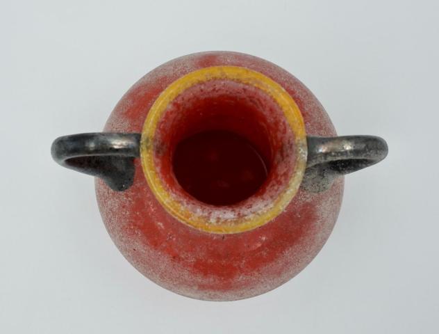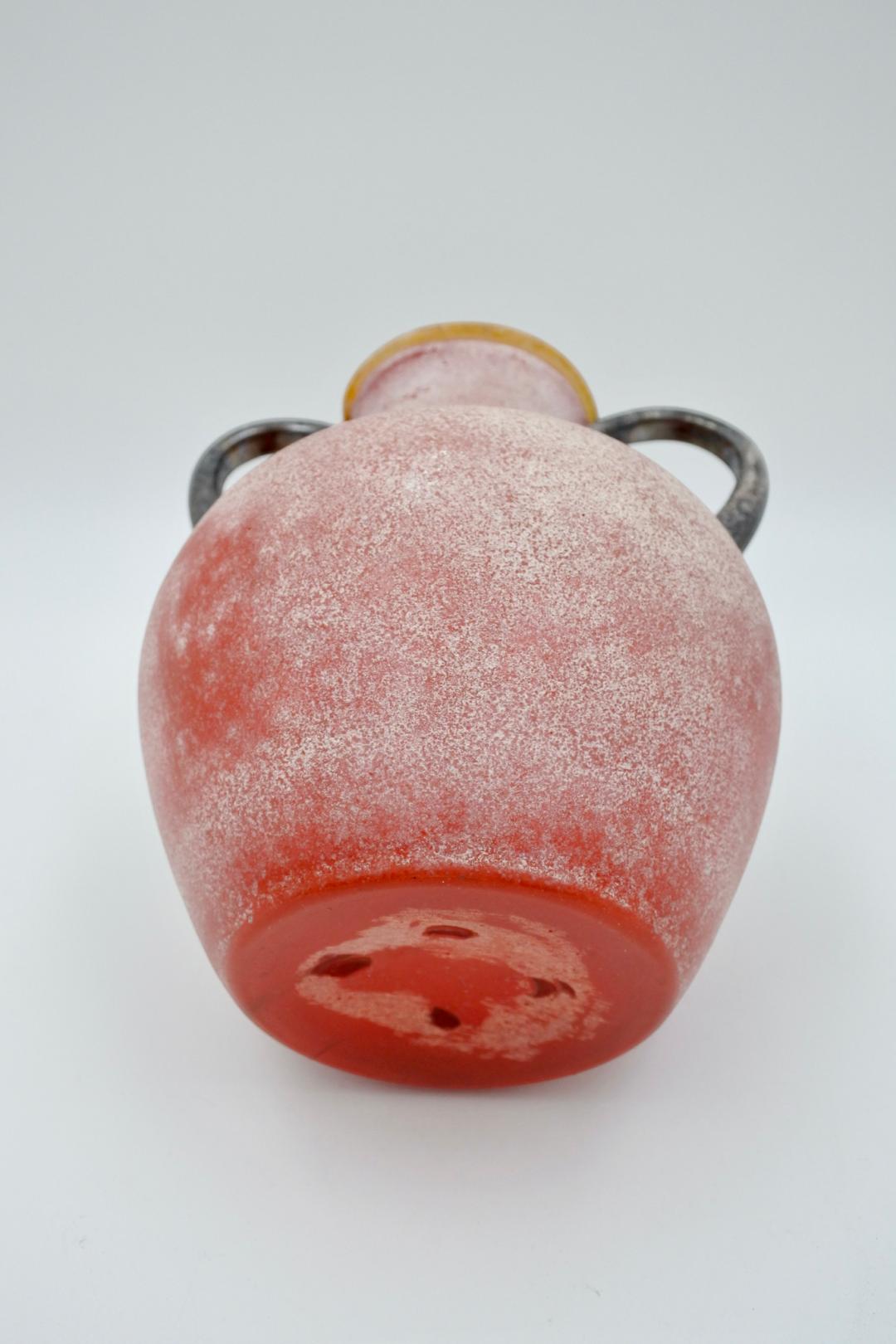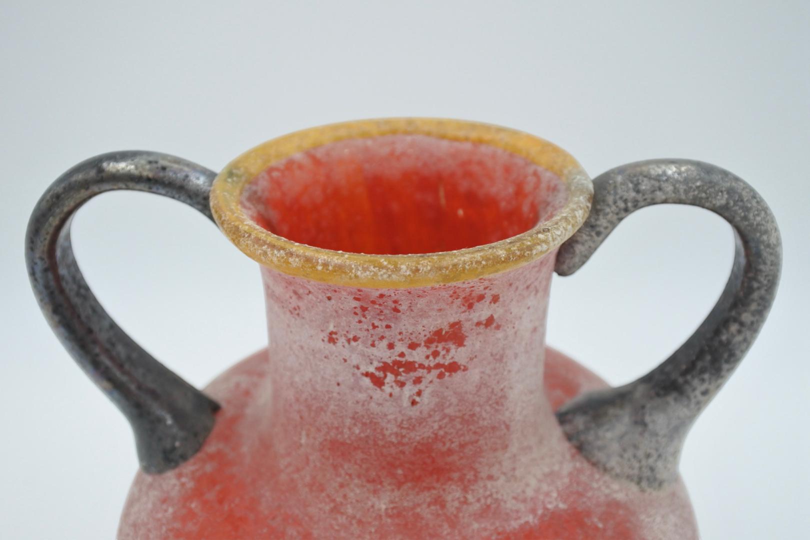 Scavo glazen vaas met handvaten, jaren 80. Het item kan hoogstwaarschijnlijk worden toegeschreven aan Murano-glasspecialist Seguso. Scavo-glascollectie: een soort sierglas met een ruw oppervlak en een matte afwerking die antiek glas imiteert, vergelijkbaar met dat van Scavo-glas. Het effect wordt bereikt door het oppervlak van het gloeiende glas, na het vormen, te besprenkelen met een mengsel van hoogsmeltende oxiden en laagsmeltende zouten. De buitenkant is daardoor ondoorzichtig, terwijl de binnenkant glanzend is. H: 19 cm. Zeer goede staat.