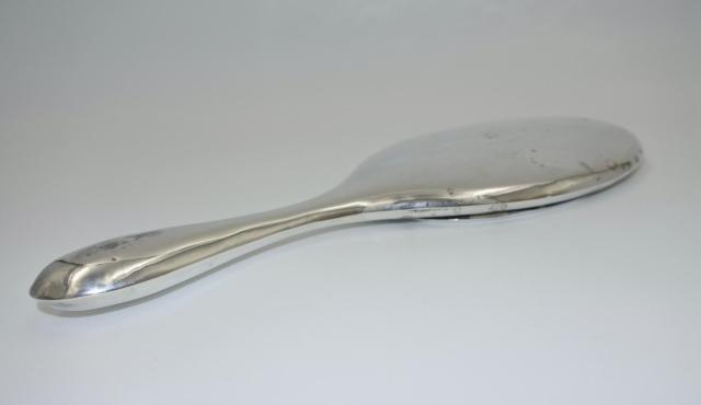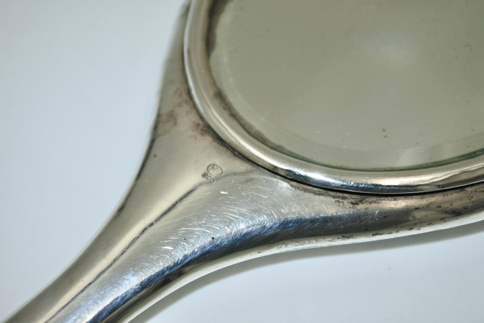 Tijdloze zilveren handspiegel. Sober modernisme. Gemerkt met meesterkeur, gehaltekeur 800. De maker is ons niet gekend. Totaal gewicht : 271 gram – L: 26 cm. – B: 10 cm.