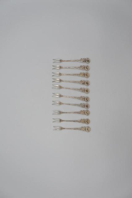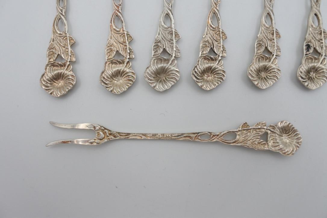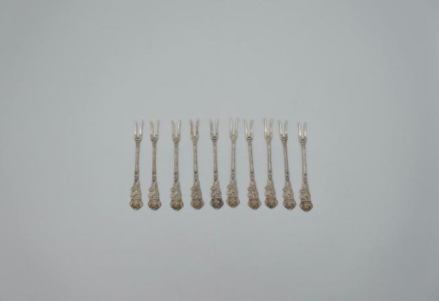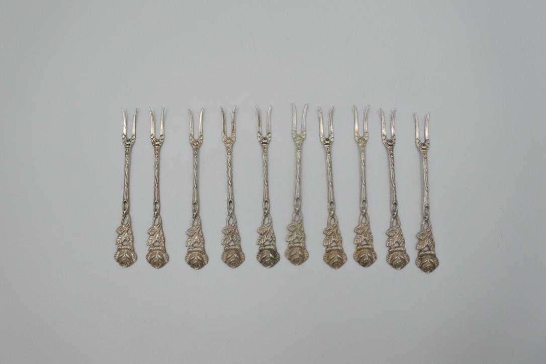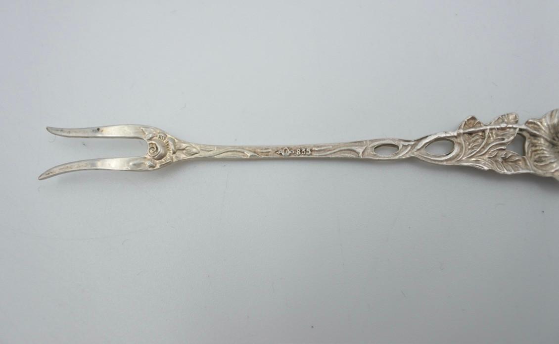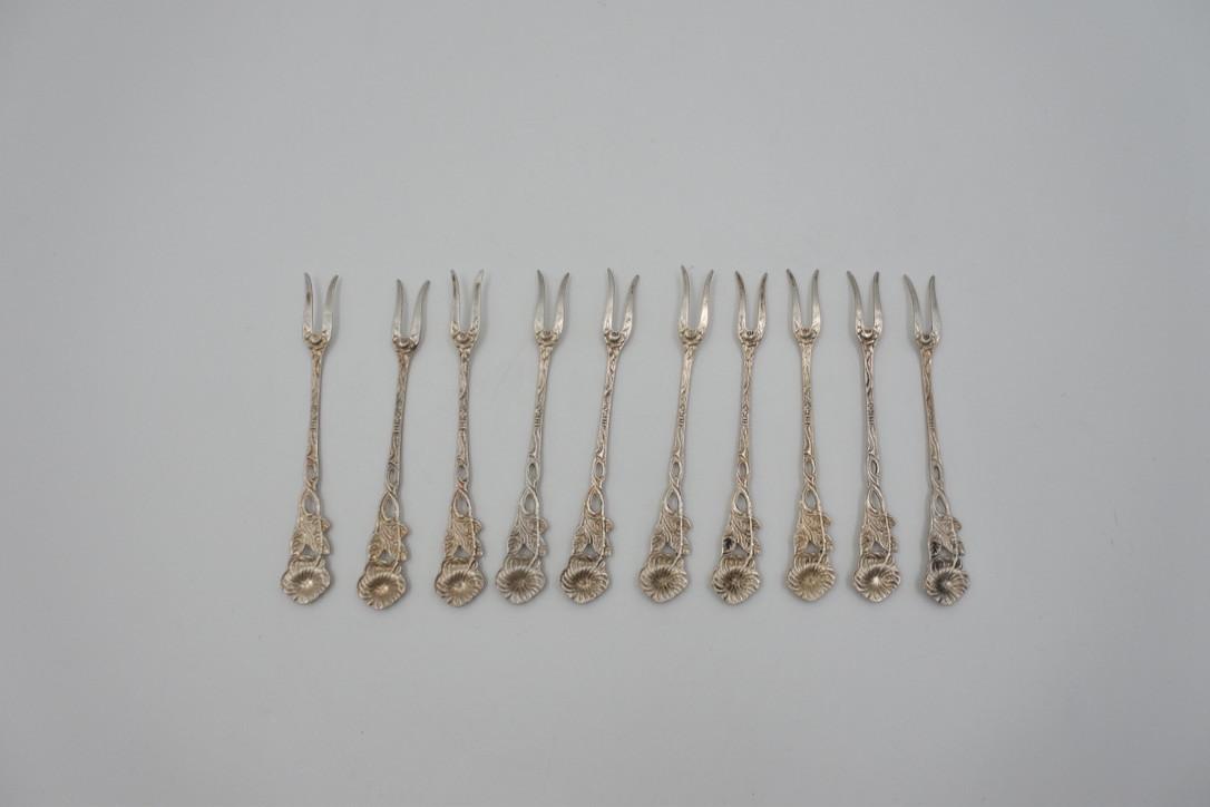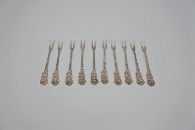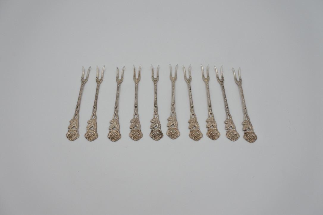 10 silver cocktail sticks from the German brand Albo. Silver content 835. Length is approximately 9 cm. The total weight is 50 grams.