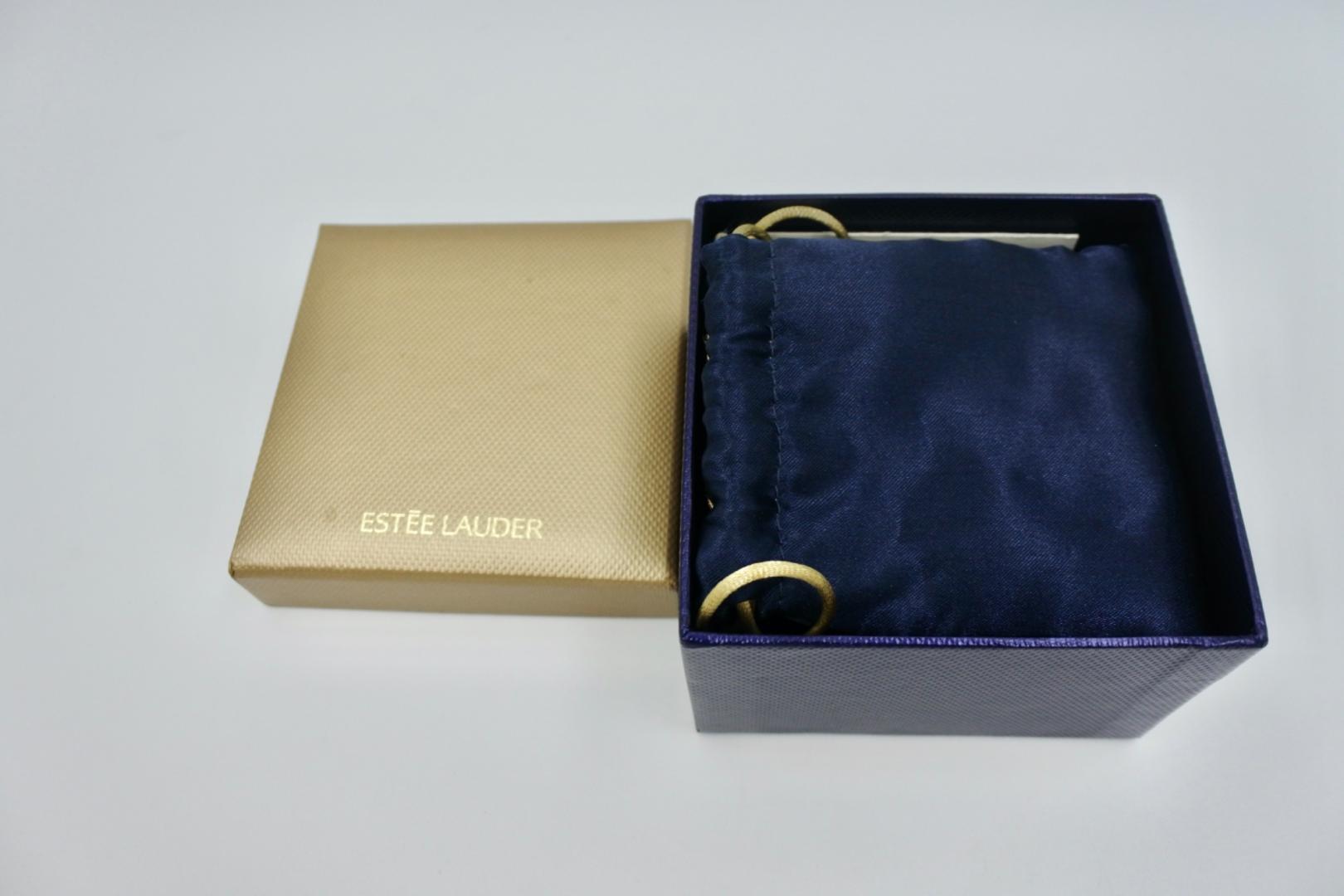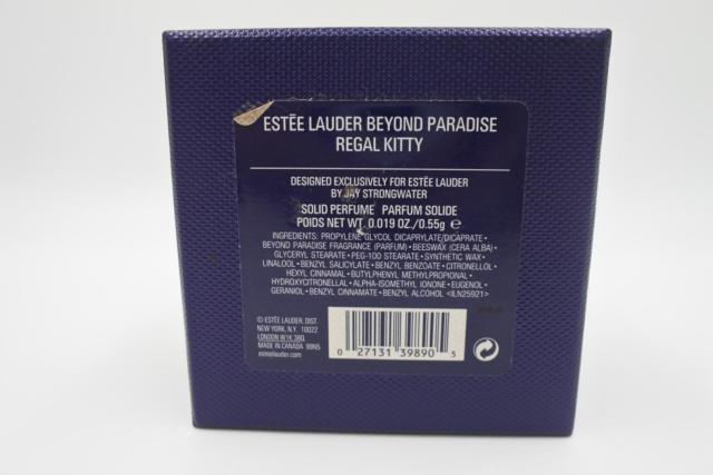 This Estée Lauder Beyond Paradise Regal Kitty Perfume Compact Designed by Jay Strongwater is an exquisite collector's piece that combines luxury and whimsical charm. This solid perfume features a detailed feline figure lounging elegantly on an opulent miniature chaise lounge, adorned with a shimmering golden finish. The cat is encrusted with sparkling rhinestones, adding a touch of sophistication, while the chair's deep red and gold enamel detailing enhances its regal appeal. Designed by the renowned artist Jay Strongwater, this compact is not only a functional perfume holder but also a beautifully crafted decorative piece, perfect for collectors of fine vanity accessories. Condition Note: The item is in overall good condition. Complete with original box. The perfume has been aged since it was produced in 2005.