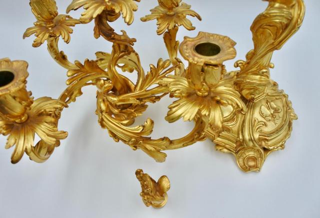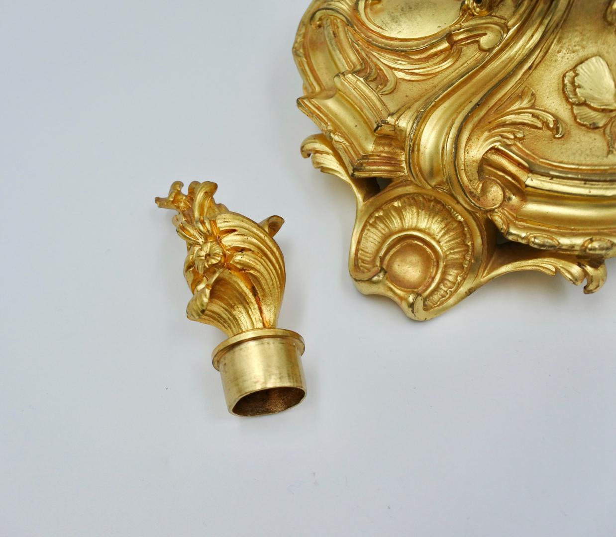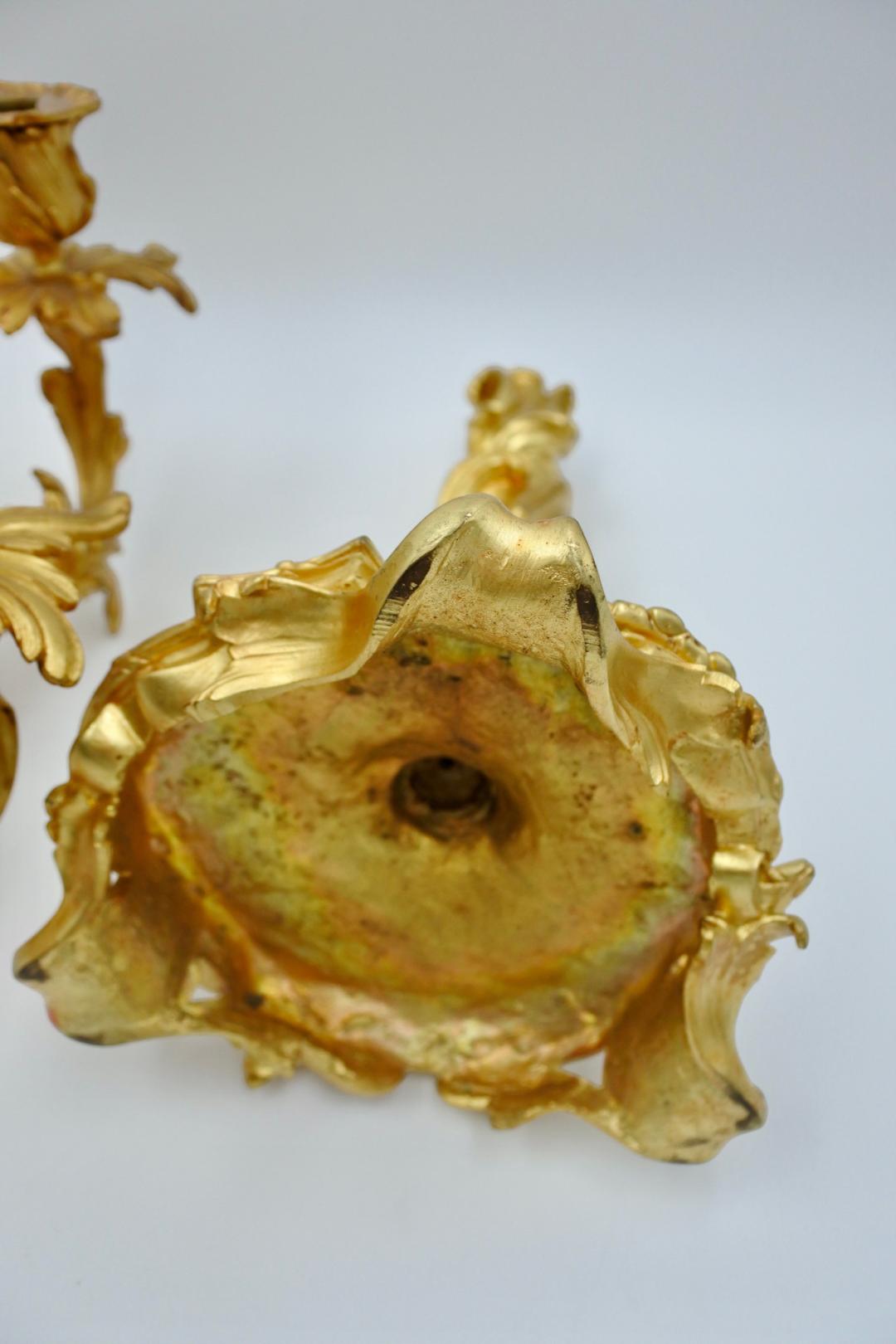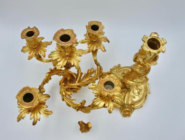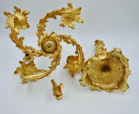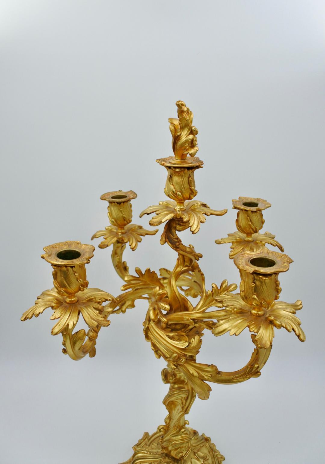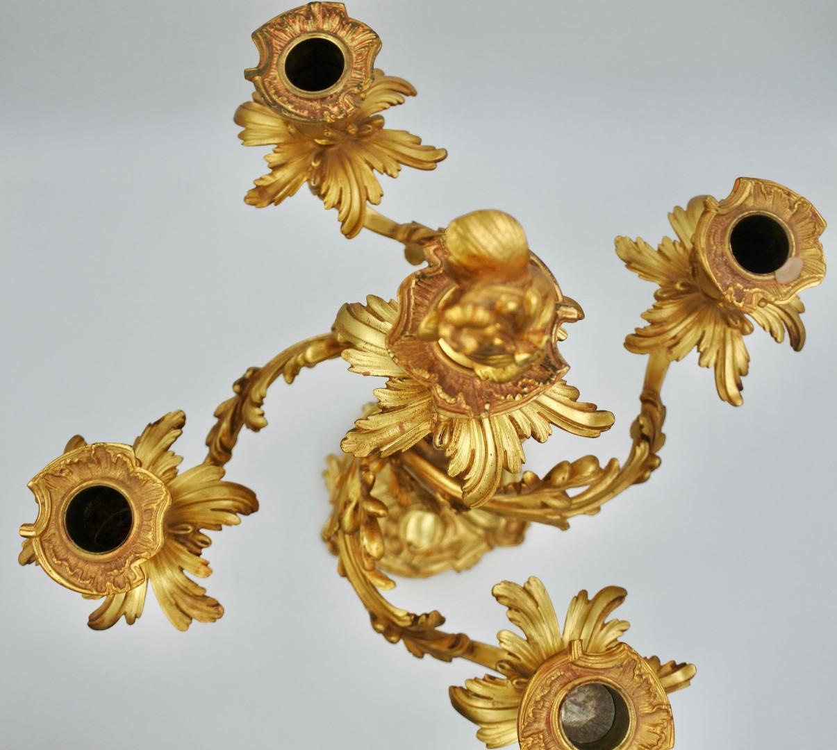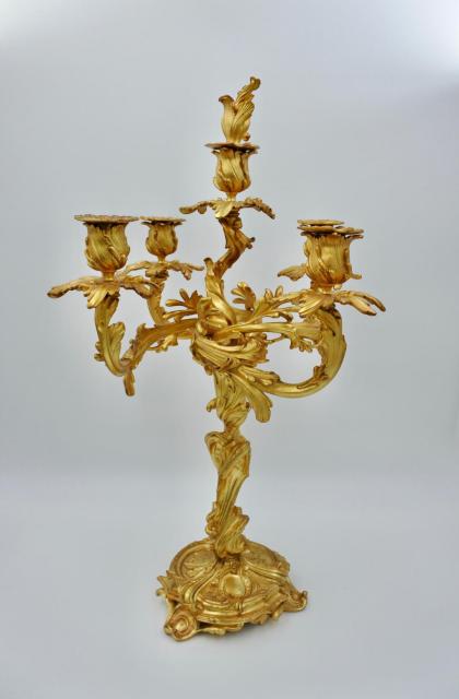 Louis XV style candelabra in chiseled and gilt bronze with five fires. Round scalloped base with a central structure made of curves and counter curves, supporting four acanthus shaped arm lights. The top of the central structure has a fifth arm light topped by a torch. Stylized plants shaped cups and candle supports. Nice Louis XV ornamentation, in the style of Meissonnier ornamental drawings in the Rocaille style, with patterns of swirls, waves and crêtes de coq. Probably work from the late 19th century. Juste Aurèle Meissonnier (1693-1750) was an architect, a goldsmith and a designer, active during Louis XV’s reign and successor of Jean II Bérain at the job of architect-draughtsman of the King’s Chamber and Cabinet. He is one of the most famous representatives of the Rocaille style (French word equivalent of the Rococo or Louis XV style). He is known for his stylized cartouches and candelabra drawings that inspired many artists and goldsmiths. Source : J. A. Meissonnier, Dousieme livre des Oeuvres de J. A. Meissonnier Livre de Chandeliers de Sculpture en Argent, Huquier, 1742-1750