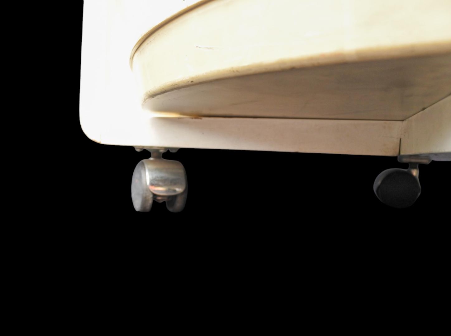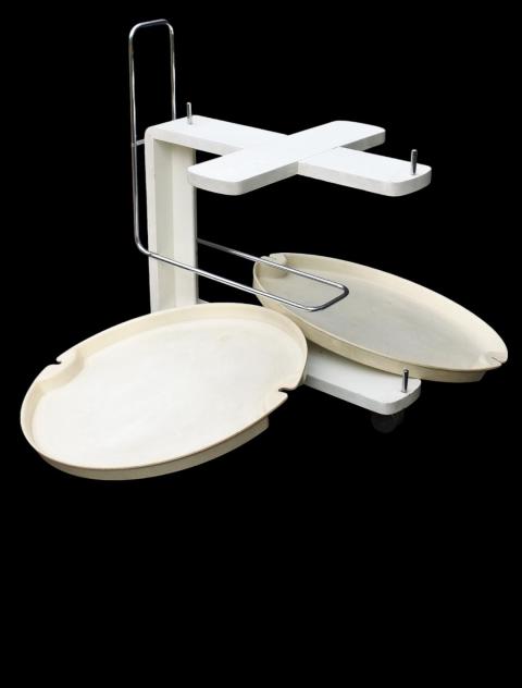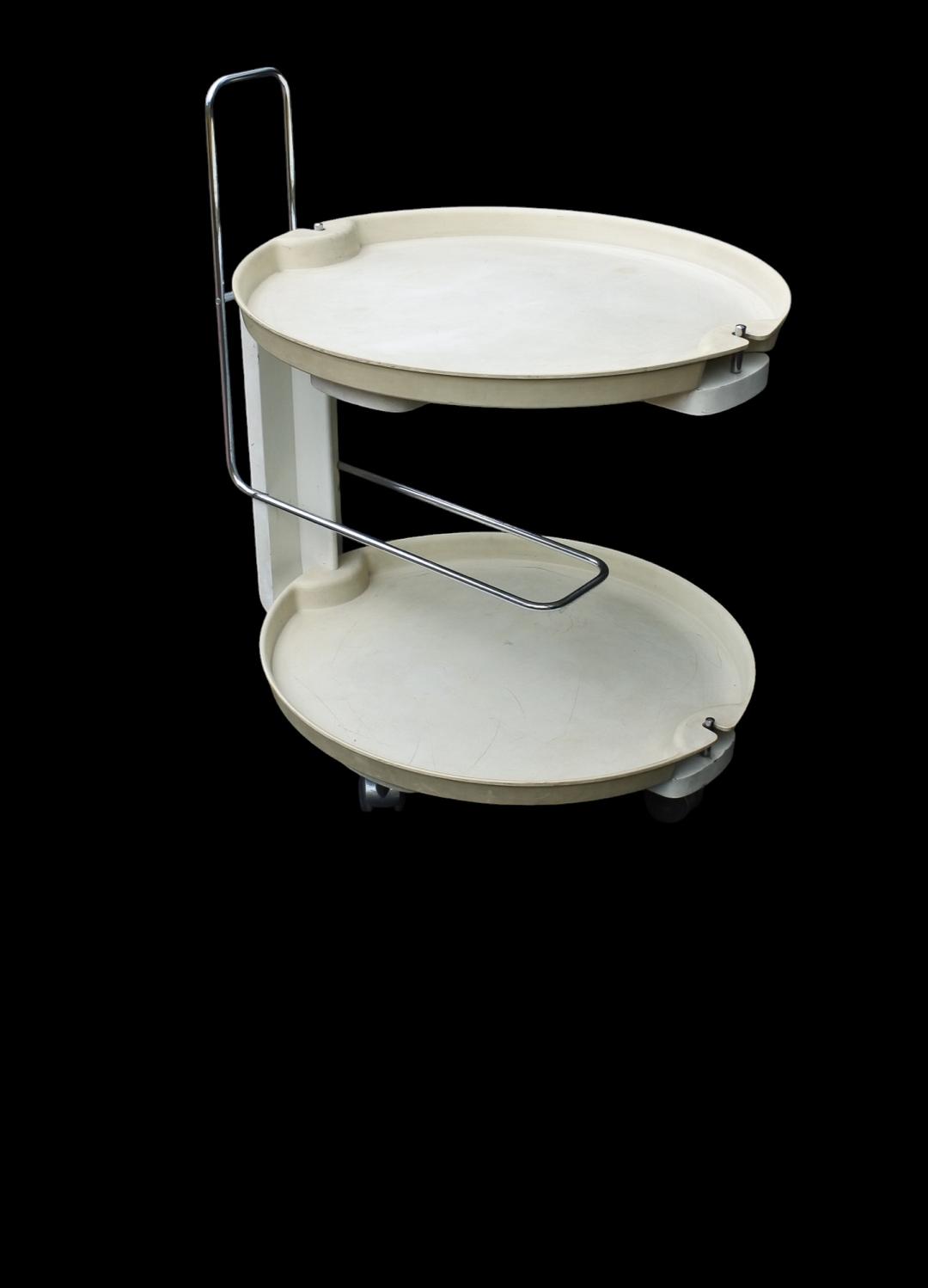 Service trolley 1980s rosenthal by Waldemar Rothe. Elegant Service bar Cart designed by Waldemar Rothe for Rosenthal, Germany. The two-tier cart has a special holder which fits some bottles and two removable trays which can be used to serve Martini's and olives. Good used condition with clear signs of usage. H: 72 – W: 55 – D: 67 cm.