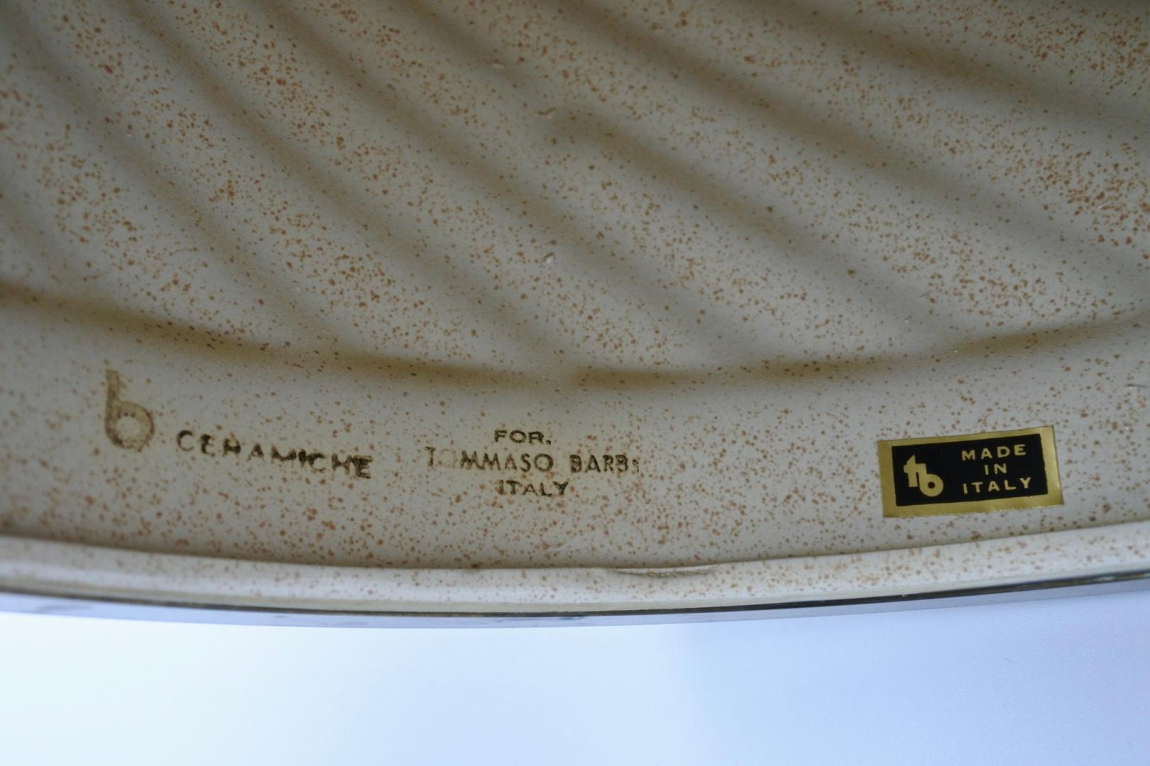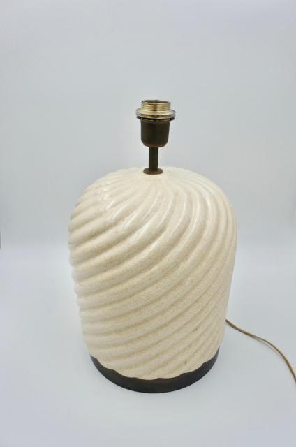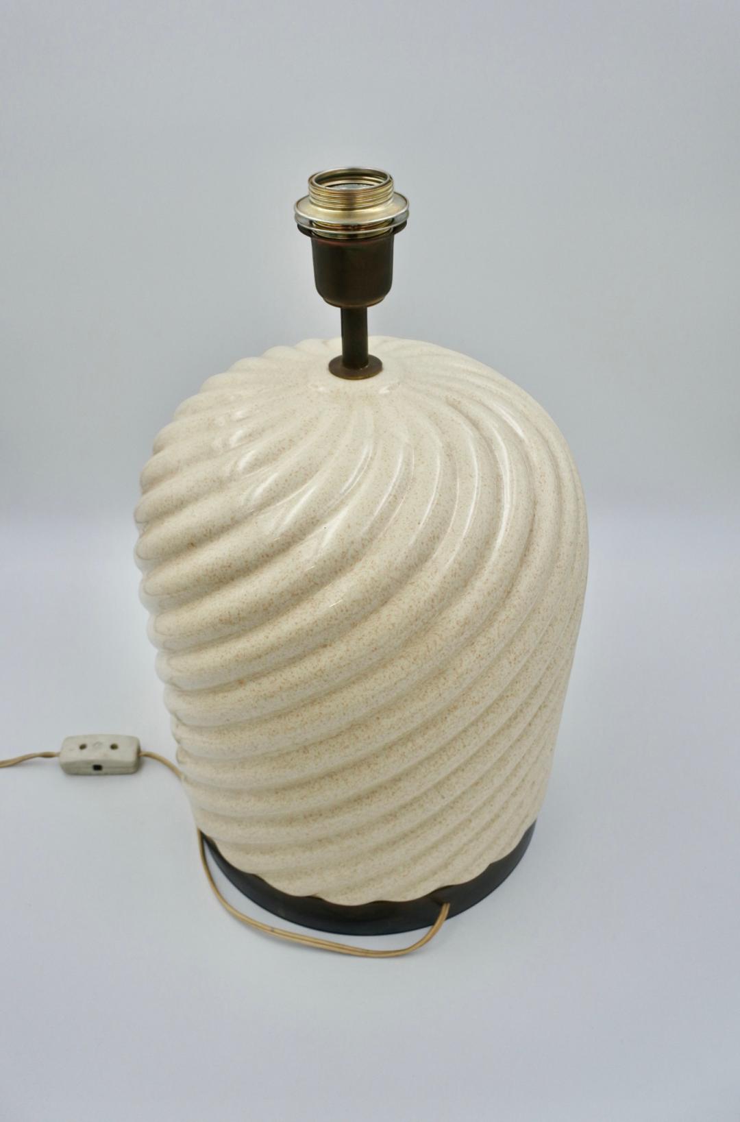 Stunning Mid-Century round table lamp in a gorgeous cream ceramic and brass. This iconic lamp was designed by Tommaso Barbi in Italy during the early 1970s and is signed inside. It is made by B Ceramiche.This elegant lamp has a round body in a spiral shaped cream colored ceramic, enriched on the bottom by a solid brass rim and on the top by a brass neck. In very good condition. H: 48 cm.