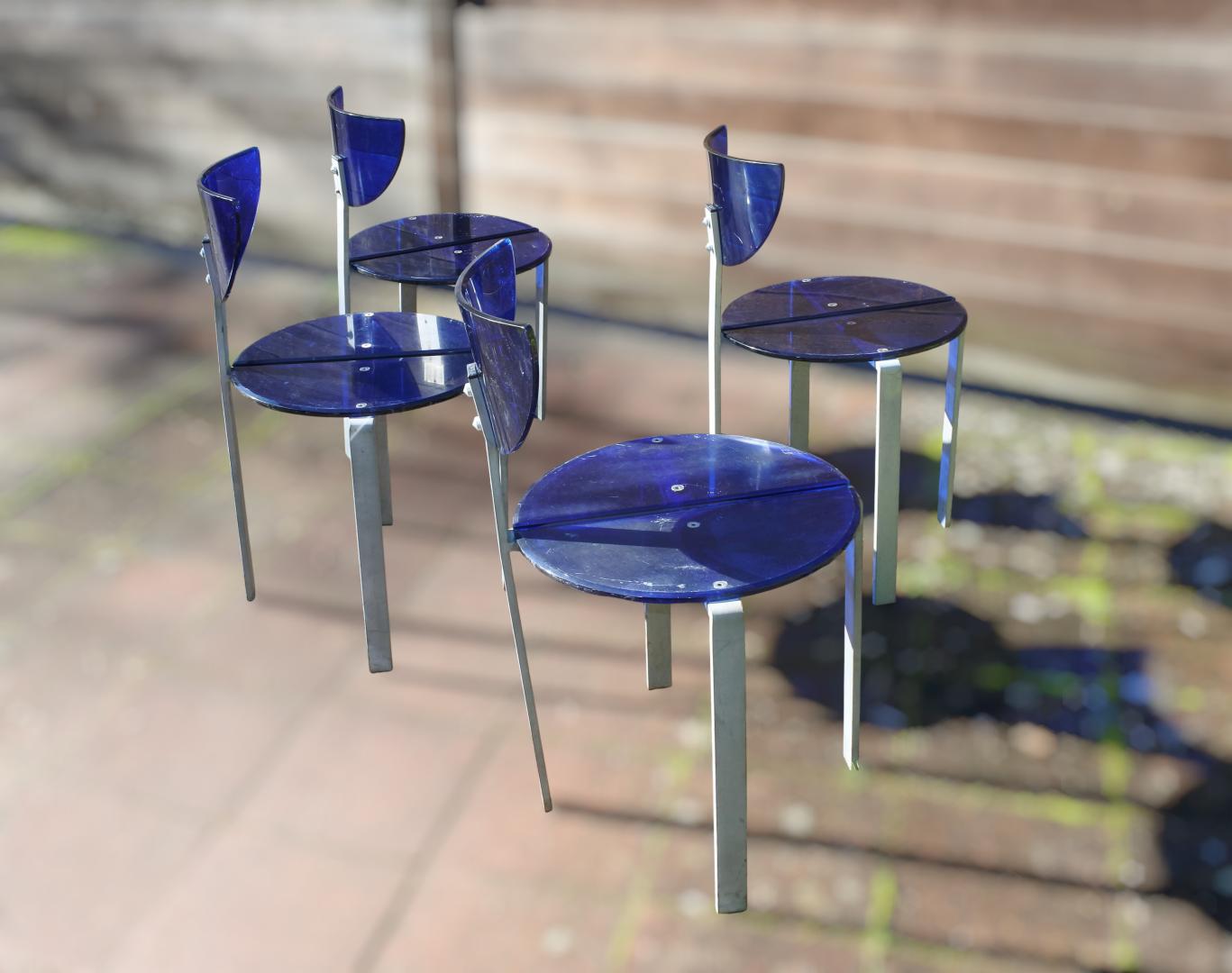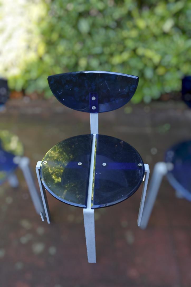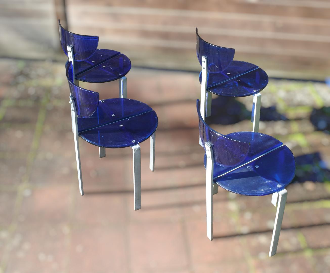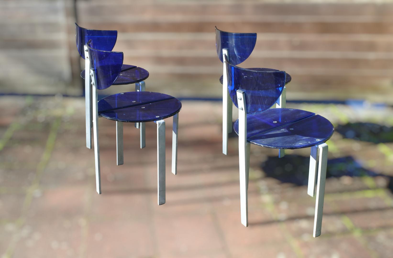 Xing WEI - Set of four chairs, grey lacquered metal frame with thick blue Plexiglas semicircles attached. H. 78 cm - W. 48 cm - D. 47 cm Used condition, scuffs on the Plexiglas and rust. Inspiration by the Luna chair of Niels Gammelgaard and Lars Mathiesen, made by Bent Krog.