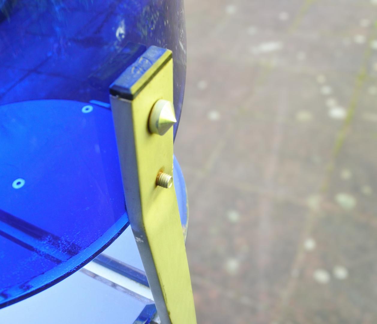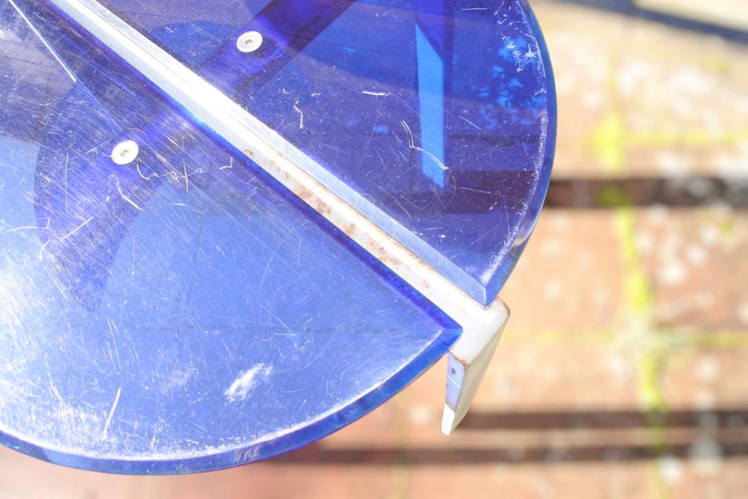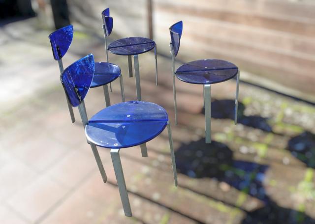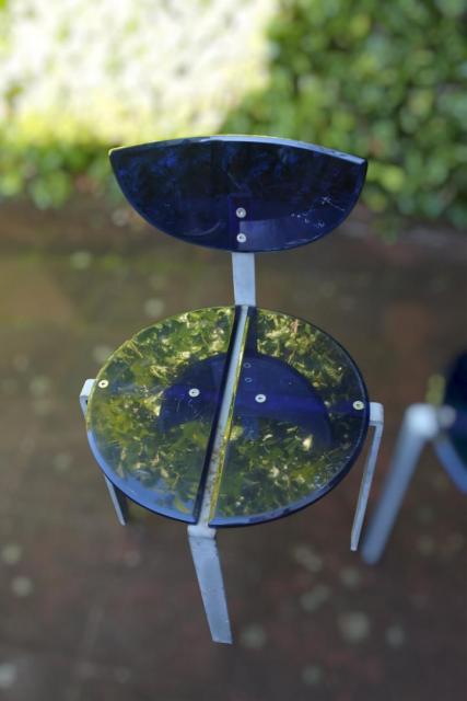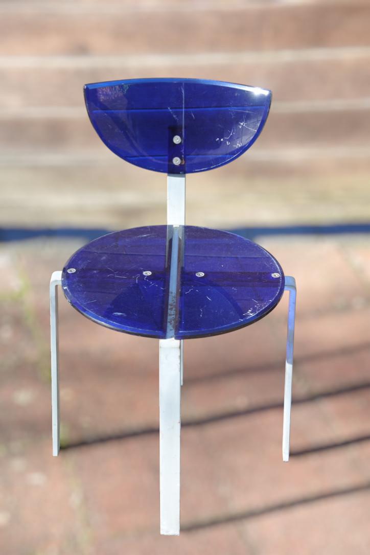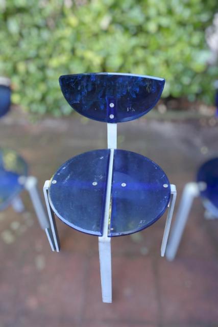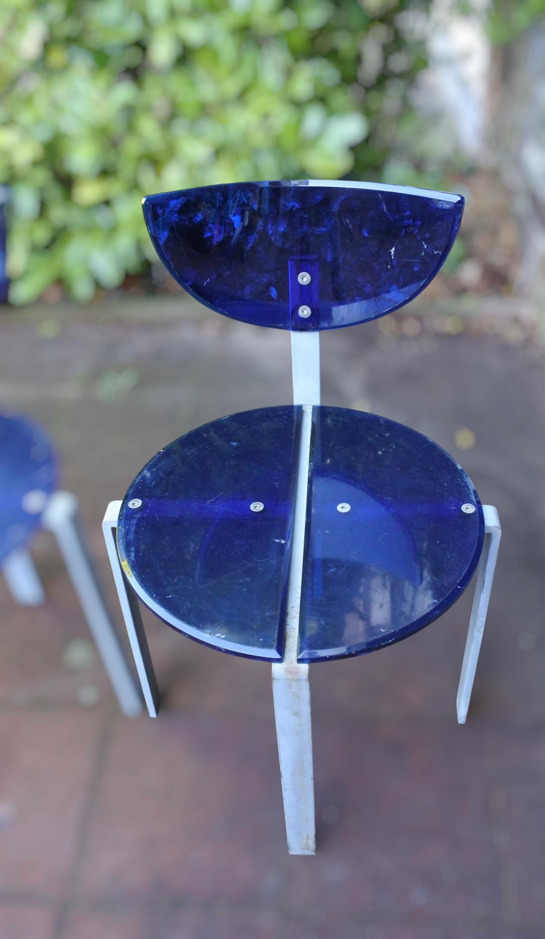 Xing WEI - Set of four chairs, grey lacquered metal frame with thick blue Plexiglas semicircles attached. H. 78 cm - W. 48 cm - D. 47 cm Used condition, scuffs on the Plexiglas and rust. Inspiration by the Luna chair of Niels Gammelgaard and Lars Mathiesen, made by Bent Krog.
