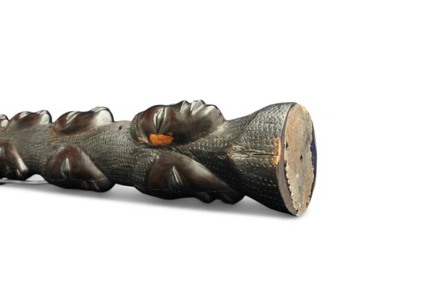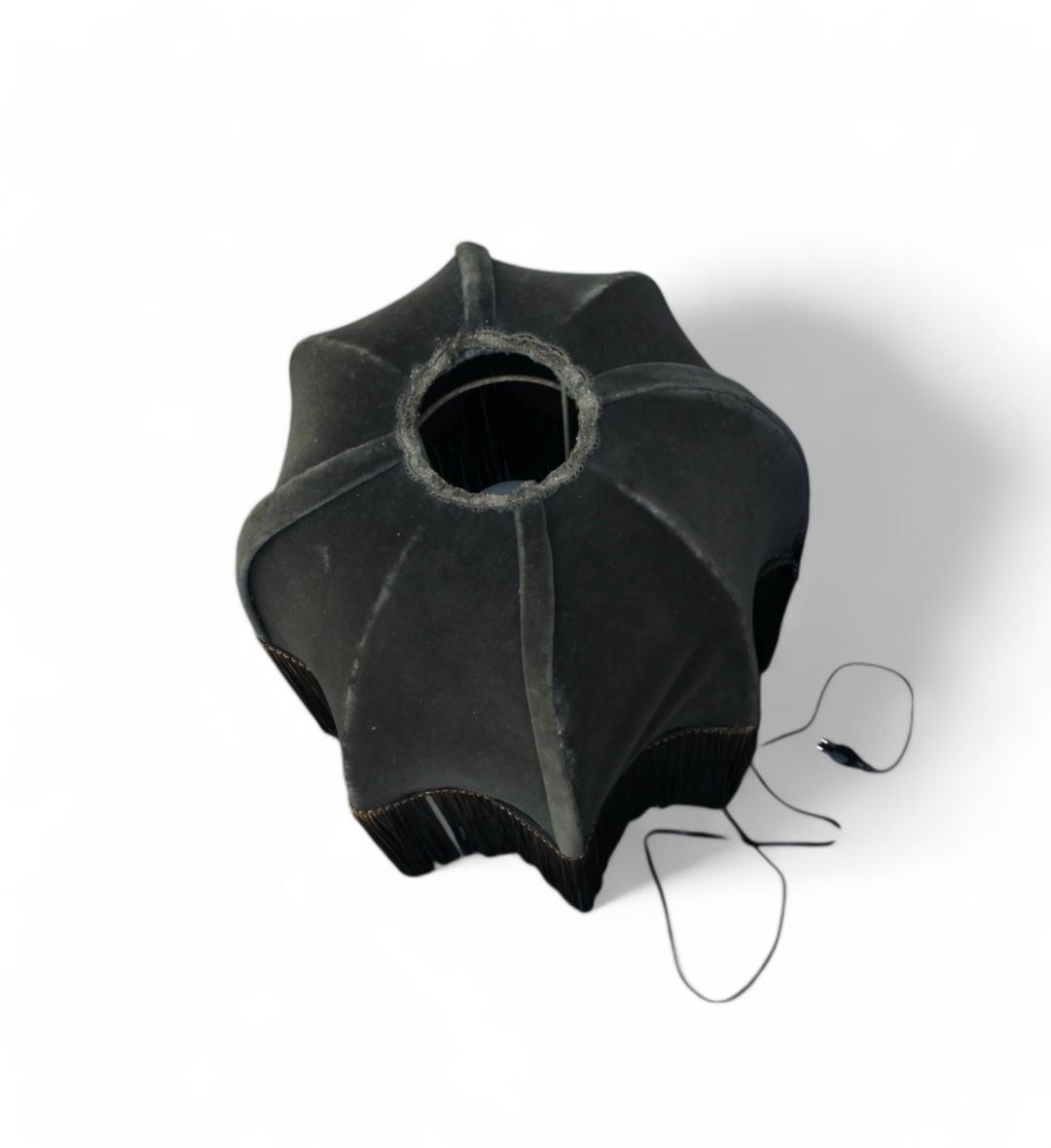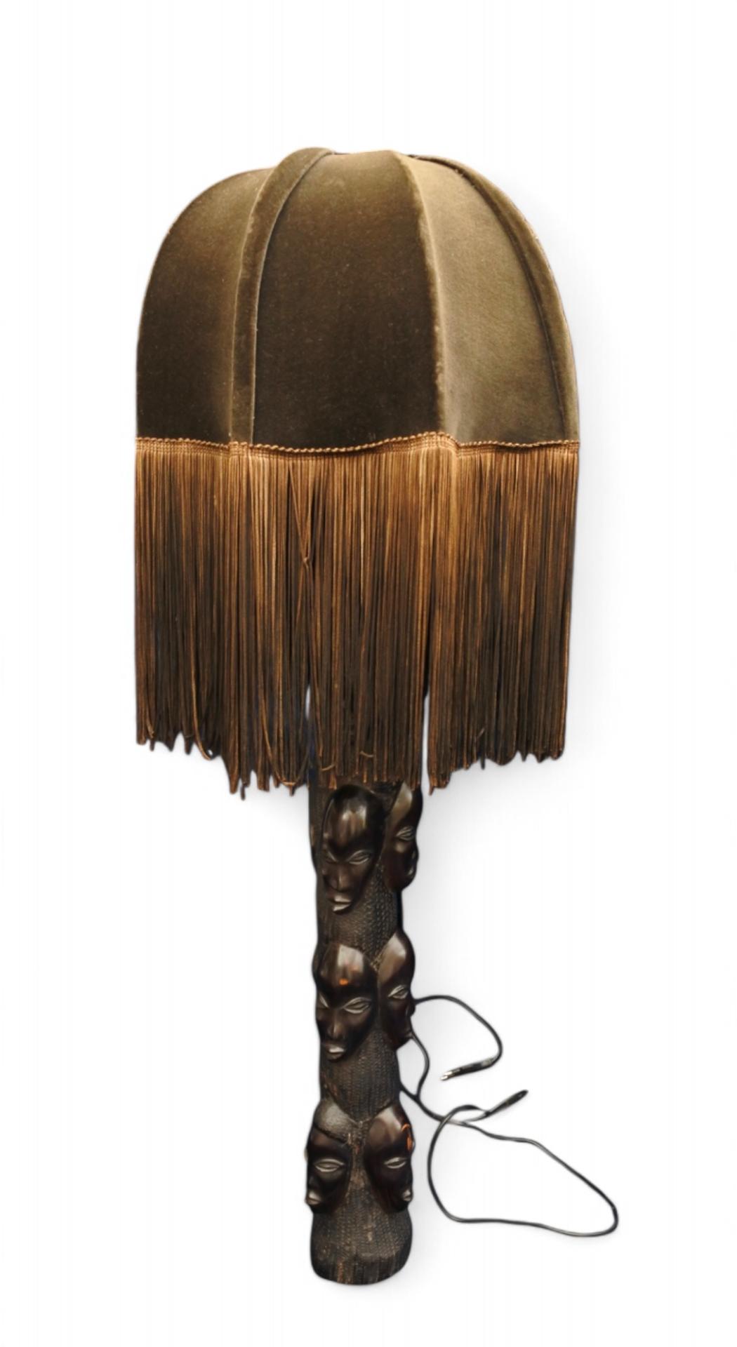 Uitzonderlijke vintage boudoir lamp. Bruin/grijze kap. Afrikaans. Fijn gesneden in exotisch hardhout van ebbenhout. Mooie toestand. H: 90 cm. - Kap: Ø 30 cm. - 4,27 kilo