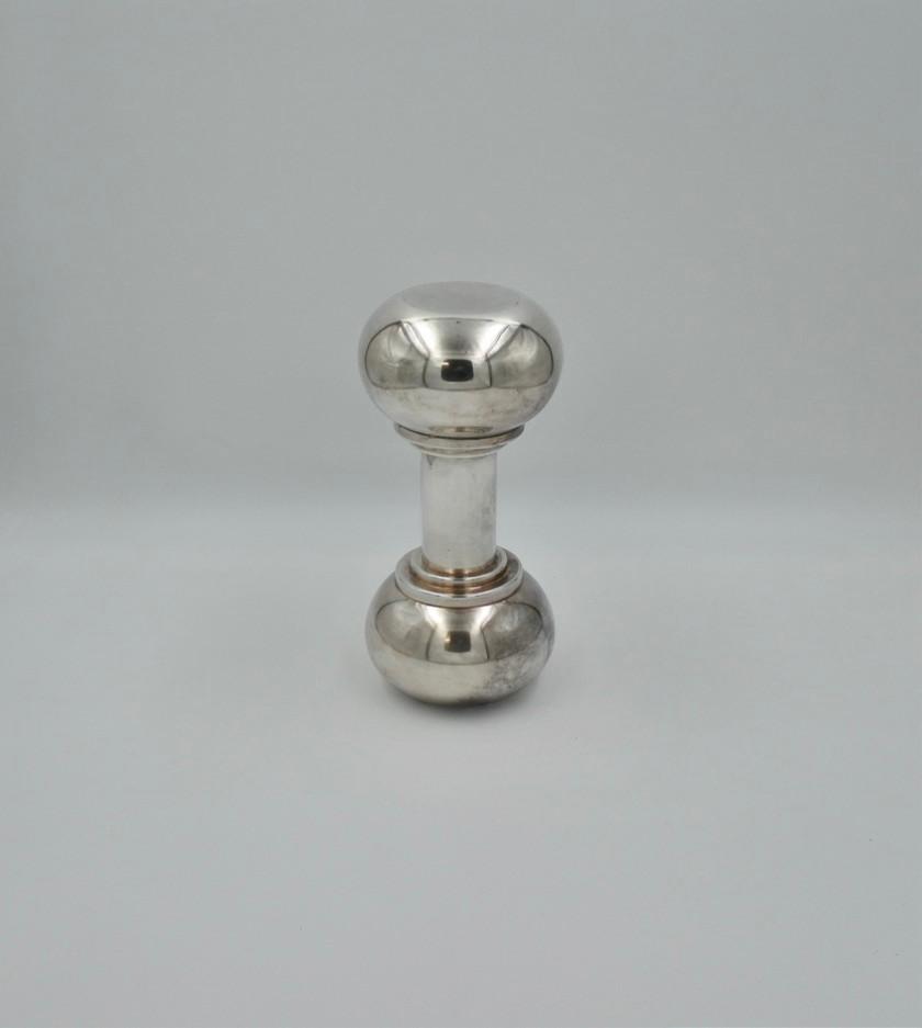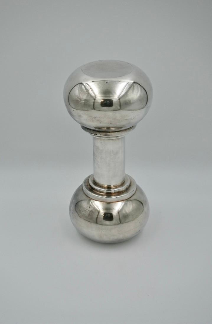 Cocktailshaker van verzilverd metaal in de vorm van een halter. In de jaren 1930 liet Asprey & Co. een hele reeks cocktailshakers met originele vormen maken en op de markt brengen, waaronder een in de vorm van een handbel en een brandblusser. De shaker in de vorm van een halter is een uitstekend baraccessoire. H: 28 cm.
