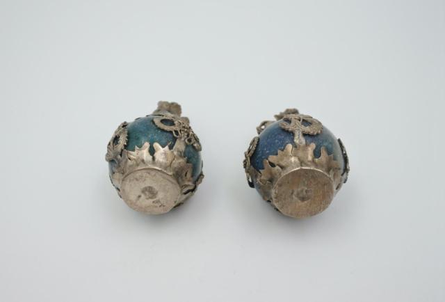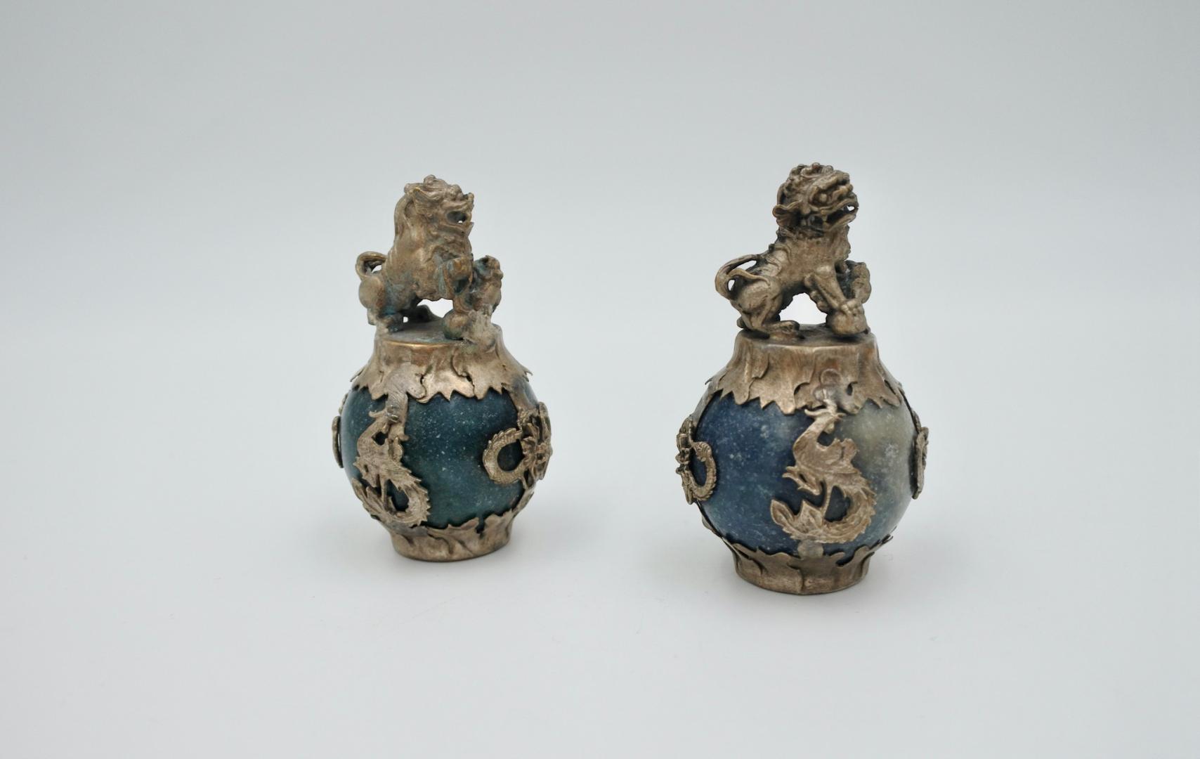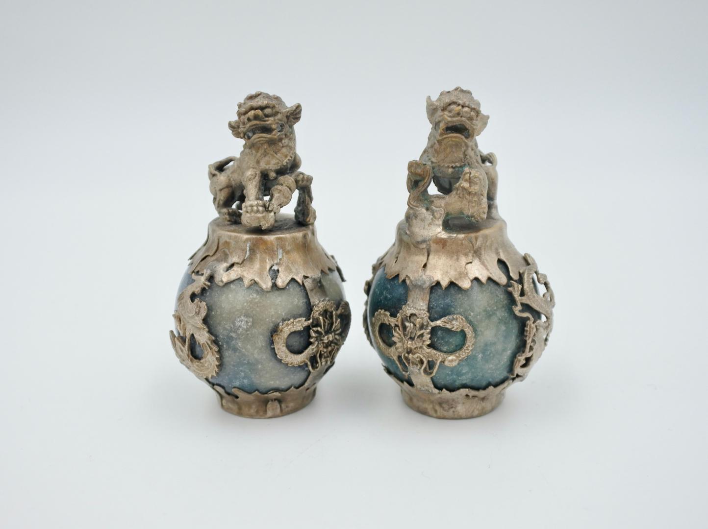 Mooi paar kleine Tibetaanse zilveren drakenleeuw Foo Dog-beeldjes op een jade stenen bal. Tibetaans zilver is een mix van metalen met een hoeveelheid antiek zilver in een onbekende verhouding. H: 7 cm. Ze wegen in totaal 218 gram. Mooie vintage staat.
