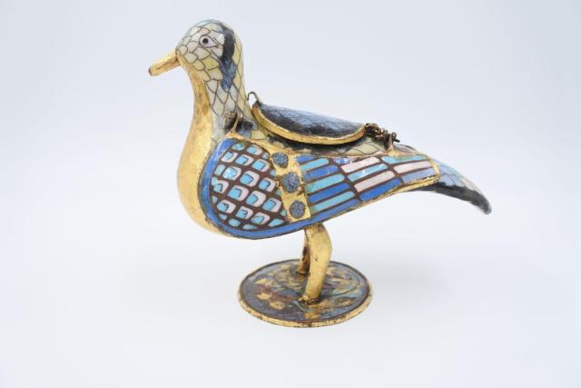 In de stijl van Limoges 13de eeuw. Liturgische houder uit edelmetaal in de vorm van een duif die tijdens de middeleeuwen boven het altaar werd gehangen, met daarin de gewijde hosties. H 14,5 - L 17 - B 8 cm.