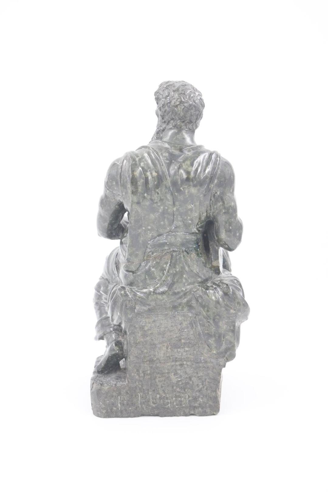 Klein, zwaar, stenen beeldhouwwerk naar het origineel van Michelangelo dat zich in de Sint-Pietersbasiliek in Rome bevindt. Getekend F. PUGET en gedateerd 1701. In goede toestand, maar het lijkt alsof de sculptuur enkele renovaties heeft ondergaan (tablet met de 10 geboden, arm) H: 26 – B: - 12 – D: 11 cm. 4 kilo