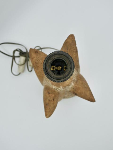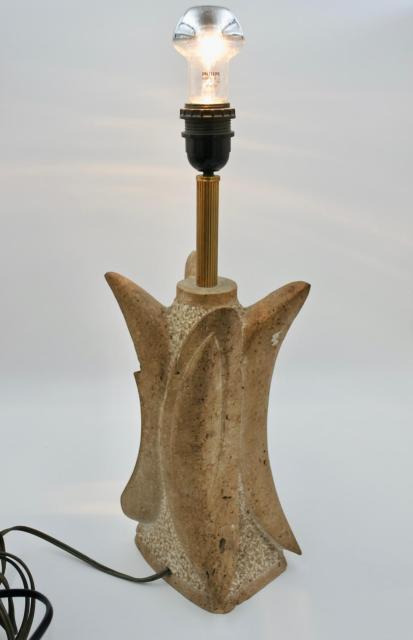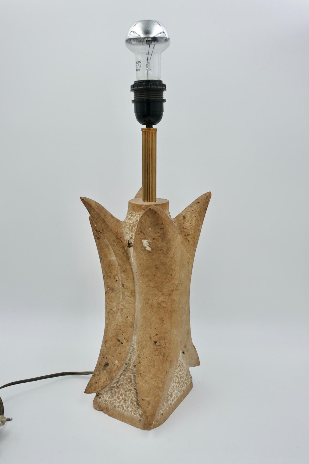 Imposant Belgisch design met een organisch brutalistisch karakter. • Stijl: Mid-Century Modern, in de stijl van Willy Daro of Pierre Faveere. • Materiaal: Massieve travertijn (natuursteen) met messing accenten. • Vorm: Uniek handgesneden ontwerp met vier opstaande, kelkvormige bladen. • Afmetingen: Hoogte 48 cm. • Gewicht: 8,5 kg (zeer solide, kwalitatieve uitvoering). • Conditie: In goede vintage staat; met normale gebruikssporen.