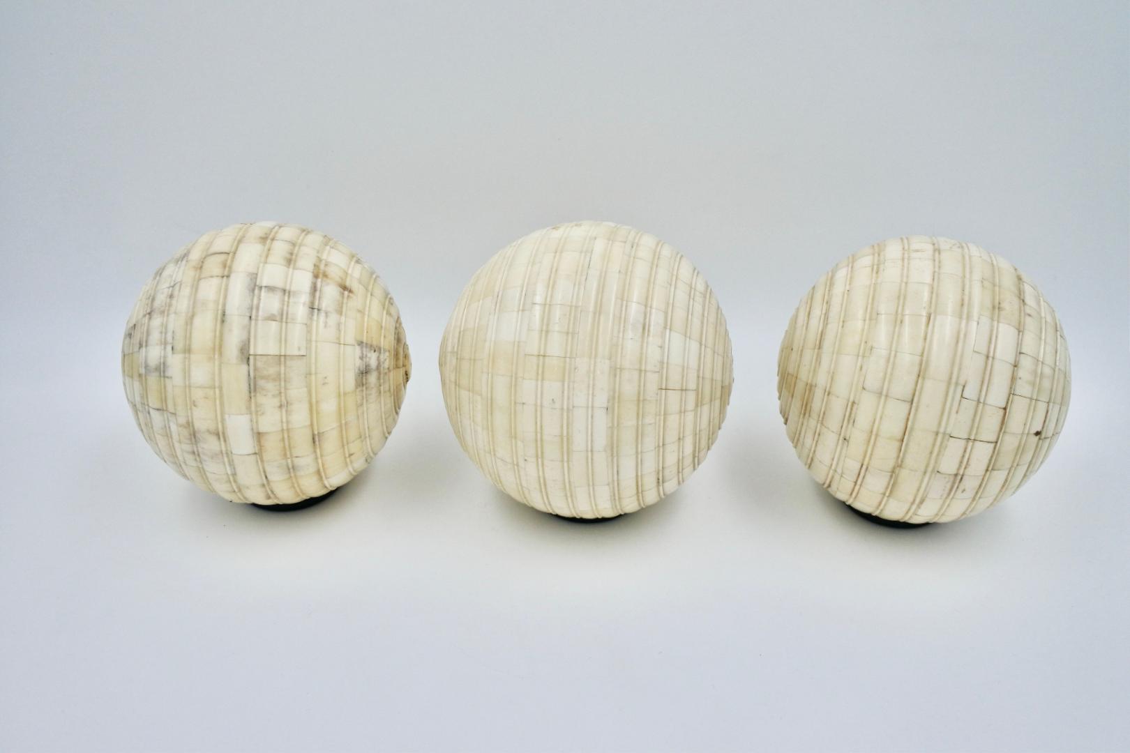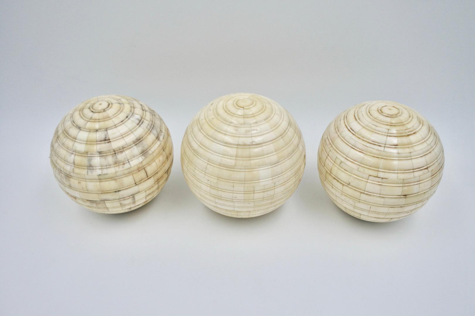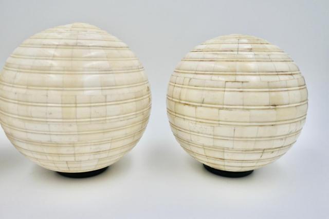 Houten bollen bedekt met mozaïek van echt bot. Vintage of ouder. Mooie patina. Diameter is 15 cm