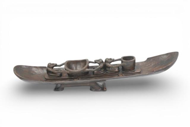 Indonesisch vakmanschap heeft deze grote originele boot opgeleverd. Uit één stuk gesneden. De boot is niet alleen decoratief, maar kan ook gebruikt worden als aperitiefschotel. Zeer origineel. In zeer goede staat. L: 75 cm. – B: 11 cm. – H: 22 cm.
