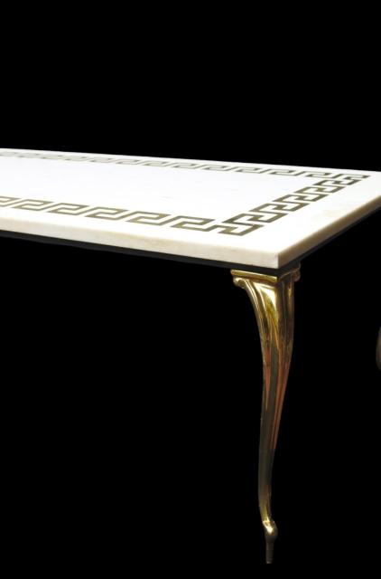 Grieks motief in messing ingelegd in wit marmeren blad. 1950’s. Het blad is afneembaar. Mooie patine met enkele krassen en 1 chip aan de zijkant. L: 115 – B: 54 – H: 43 cm. Totaal gewicht circa 40 kilo.